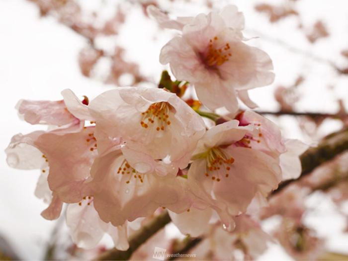 桜の花に雫がしたたり、雨とともに少しずつ散る姿は、少し寂しさを誘うような…。