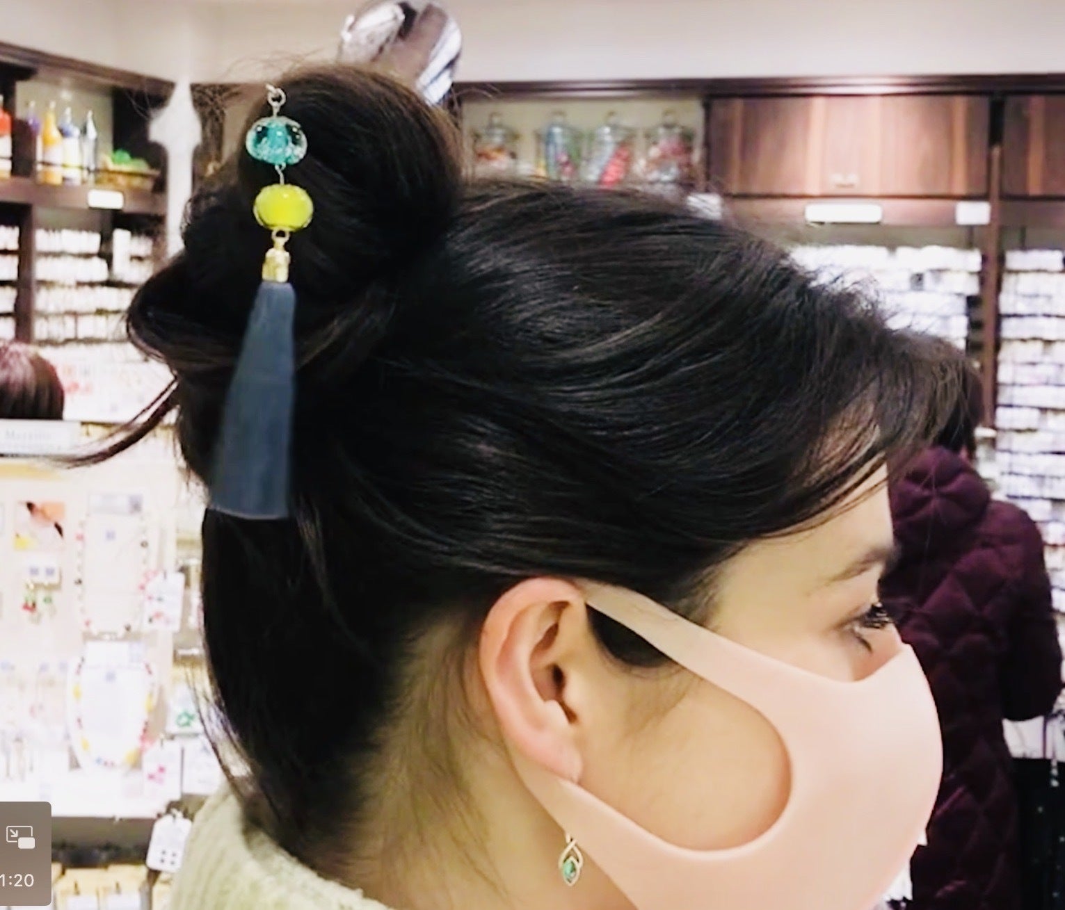 早速、髪をアップに巻いてかんざしをセット。