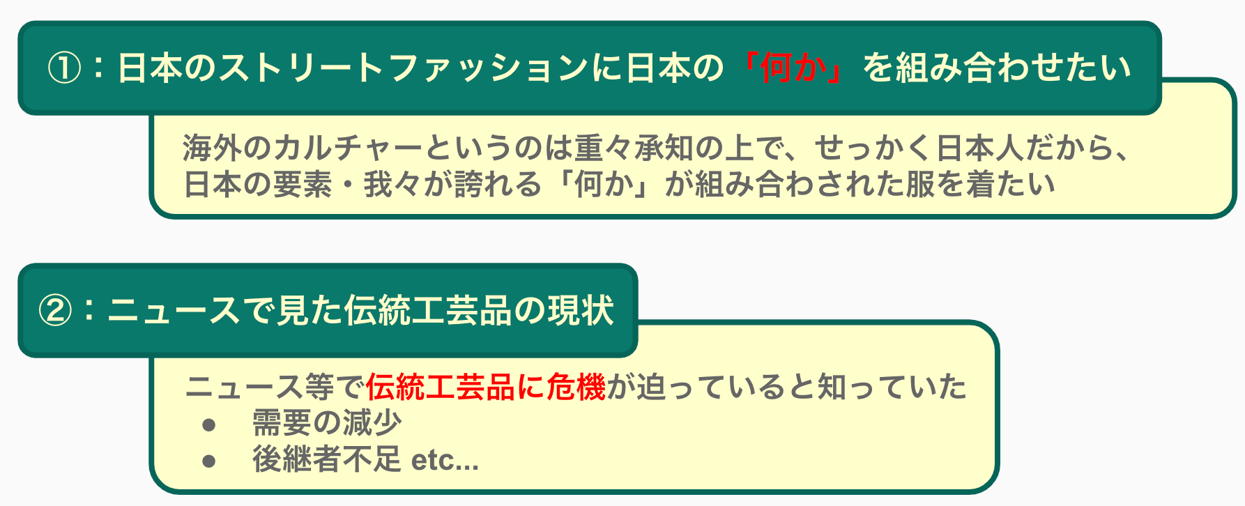 皆様もニュースなどで目にすると思いますが、伝統工芸品には需要の減少・後継者問題など様々な課題があります。それらの課題により日本にある沢山の伝統工芸品、その文化・歴史が全体を通して存続の危機に瀕していることに危機感を抱きました。そのような課題に対して、私たちは「消費の底上げ」「現代に寄せた文化の登用」に着目し、伝統工芸品×現代ファッションのアパレルブランドの立ち上げをしようと考えました。