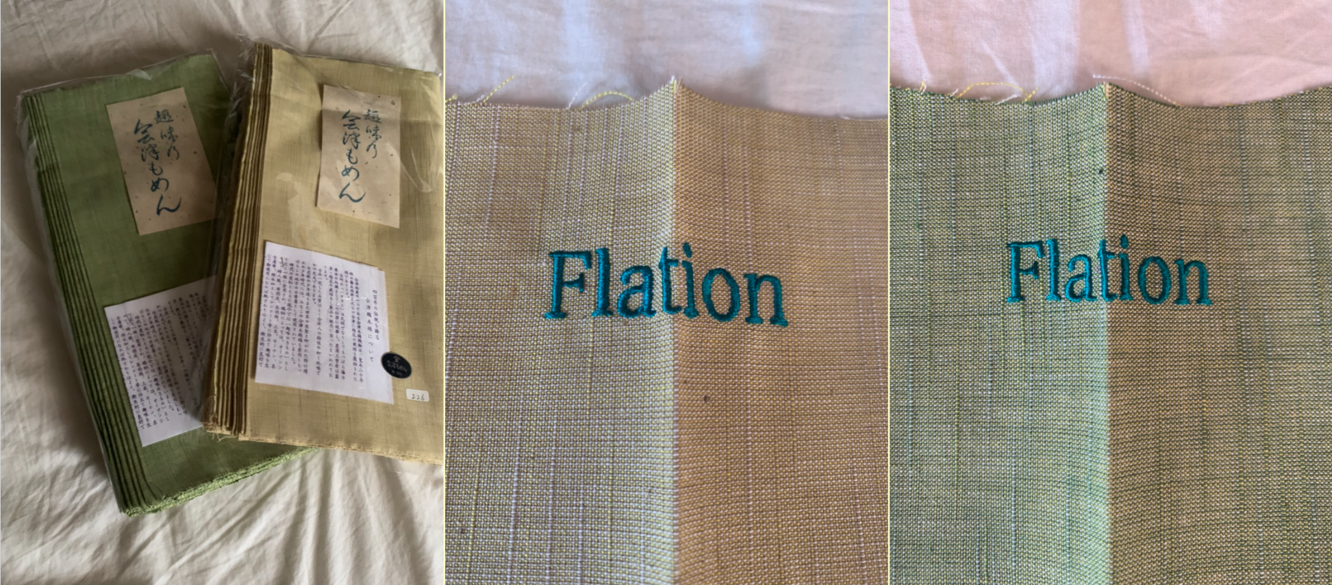 今回は無地の若草色・クリーム色の生地を使用しましたが、無地にも関わらず、ランダムな縞模様で近くで見ると単なる無地ではない使用になっております!