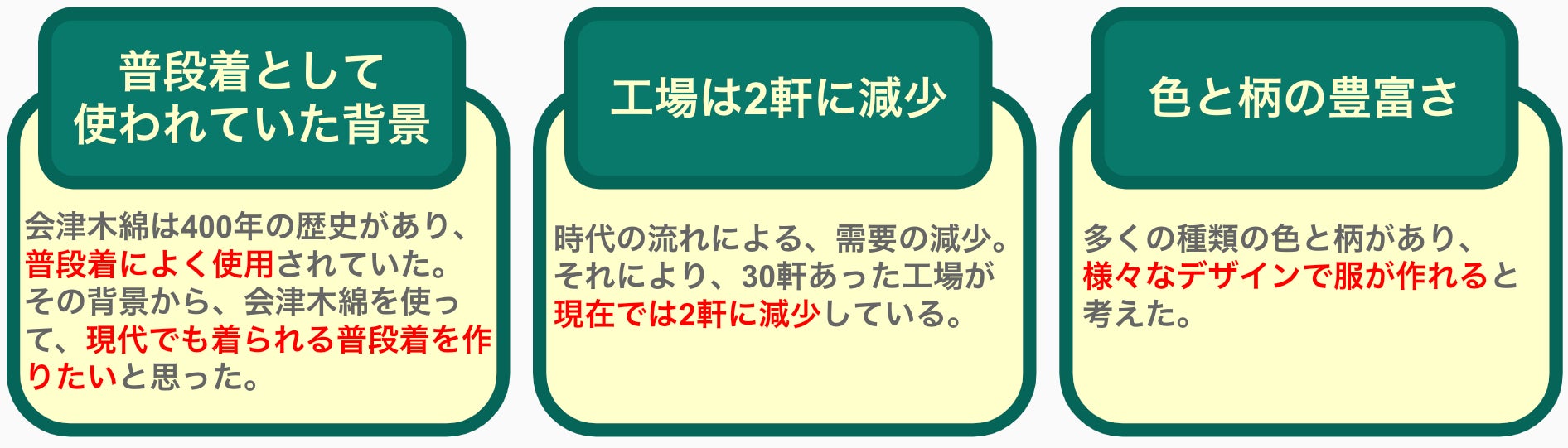 そして当時使われていた、服を販売するのでは消費は上がらないと考えました。そこで、その服の生地を使った現代ファッションの服を販売する。→伝統工芸品を守りつつ、消費を上げられると推測しました。