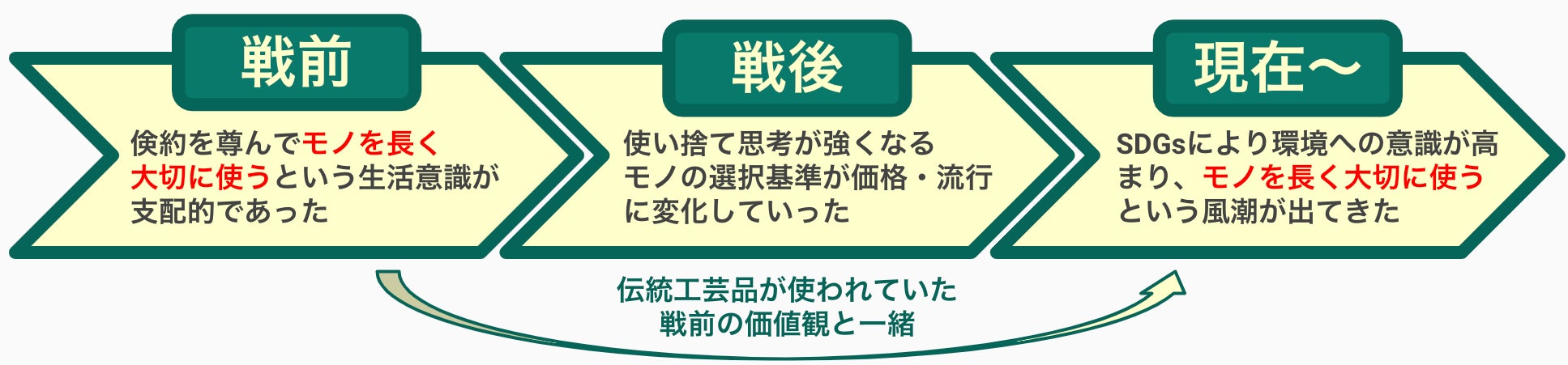 私たちは、戦前から現在までの間のモノに対する選択意識の変化を3つのフェーズに分けて考えました。その結果、戦前と現在では「モノを長く大切に使う意識」という共通点があることに気がつきました。