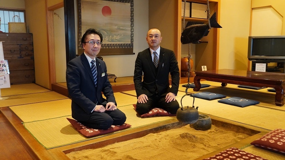 館内に足を踏み入れると、まず目を引くのがこの囲炉裏。憩いの場所として、皆様に愛されています。囲炉裏を囲んで話に花が咲くお客様を見ると、こちらまであたたかい気持ちになります。