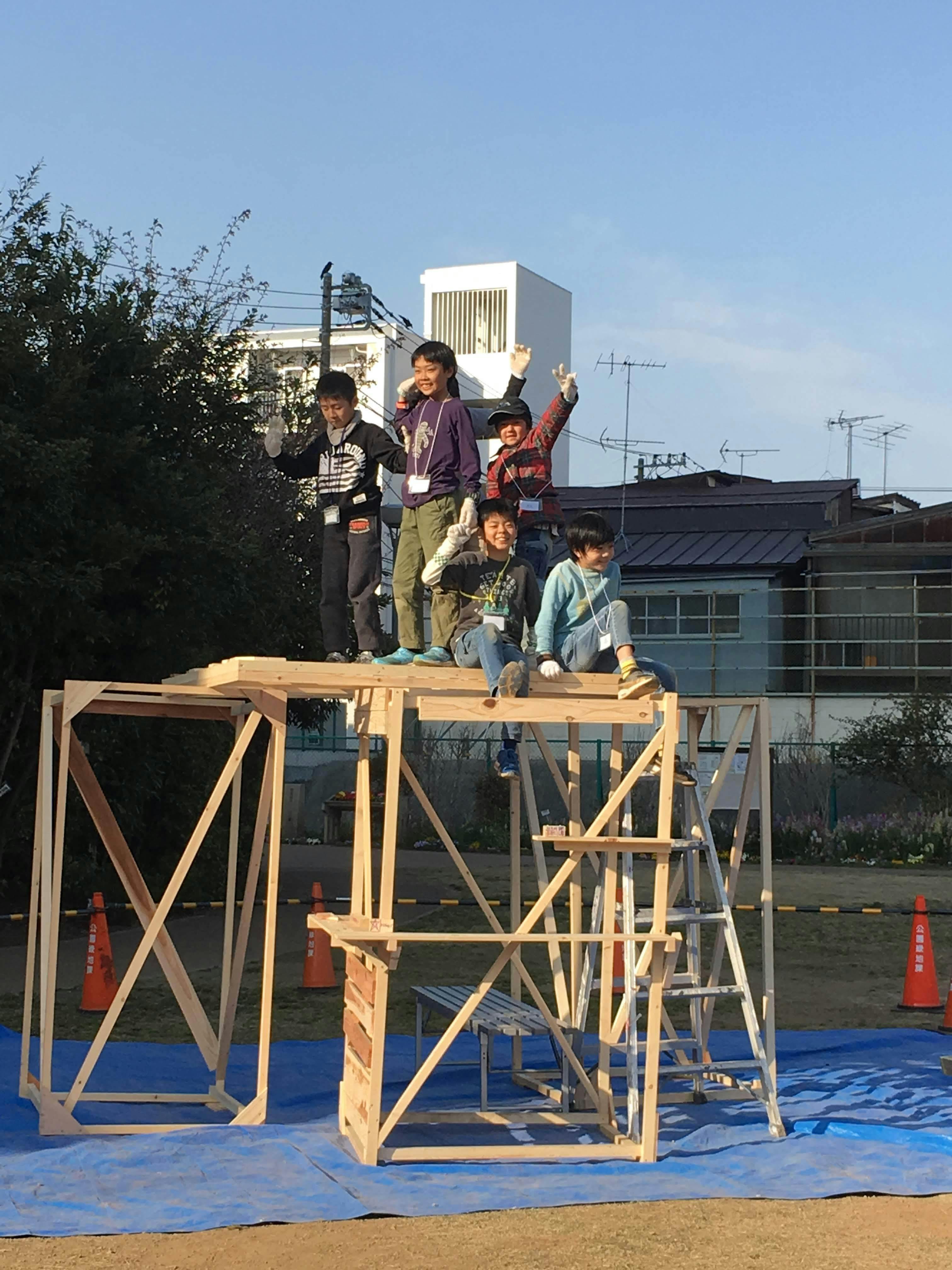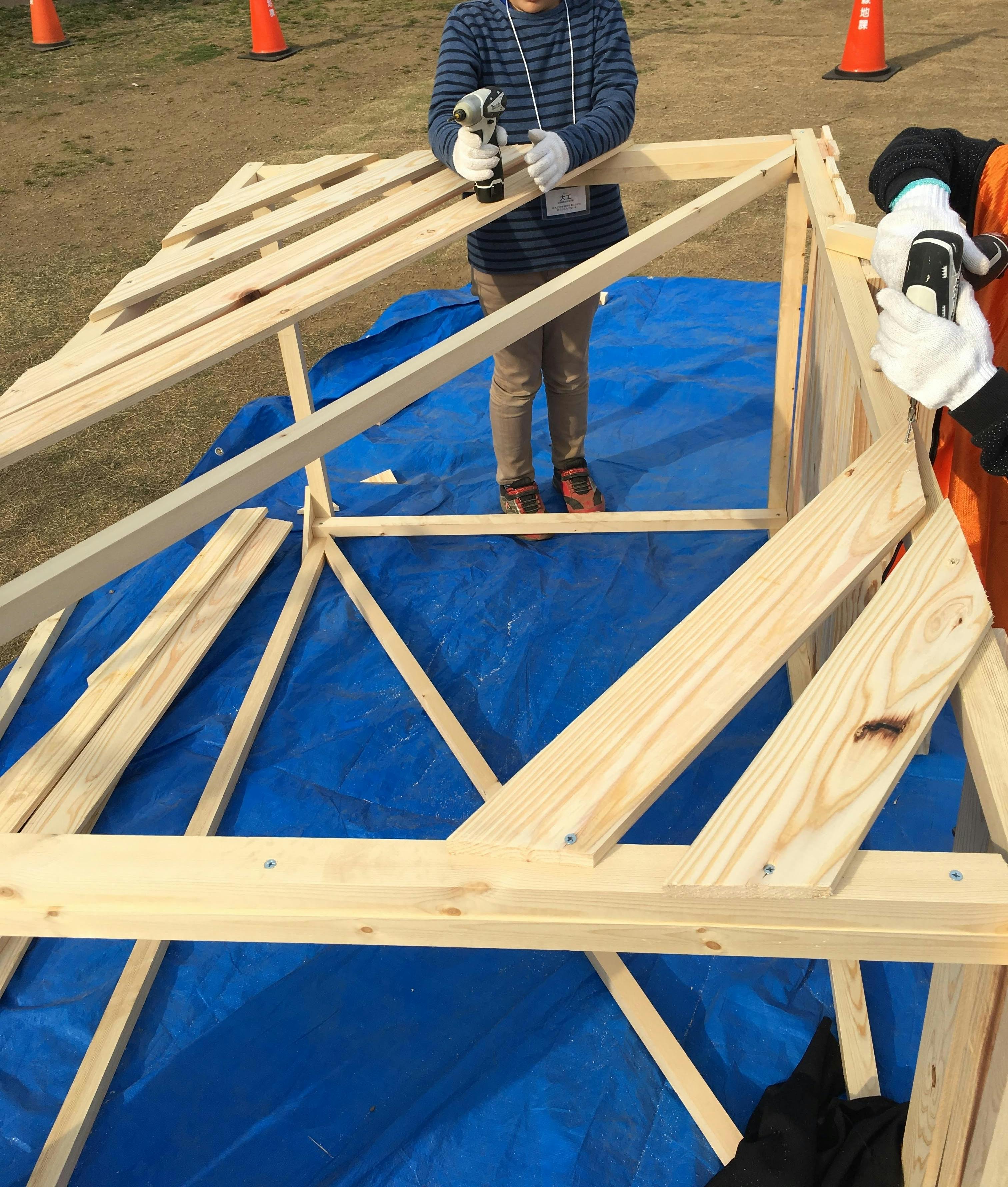 ちょっぴり危なっかしい、自分の身体より大きいものをチカラをあわせて作る体験はとてもワクワクするものです。なぜなら決して一人で作ることができないから。ビスを止める間他の子に木材を支えてもらったり、壁のデザインをどうするか話し合ったりと、自然と知らない子同志で協力し仲良くなっていきます。