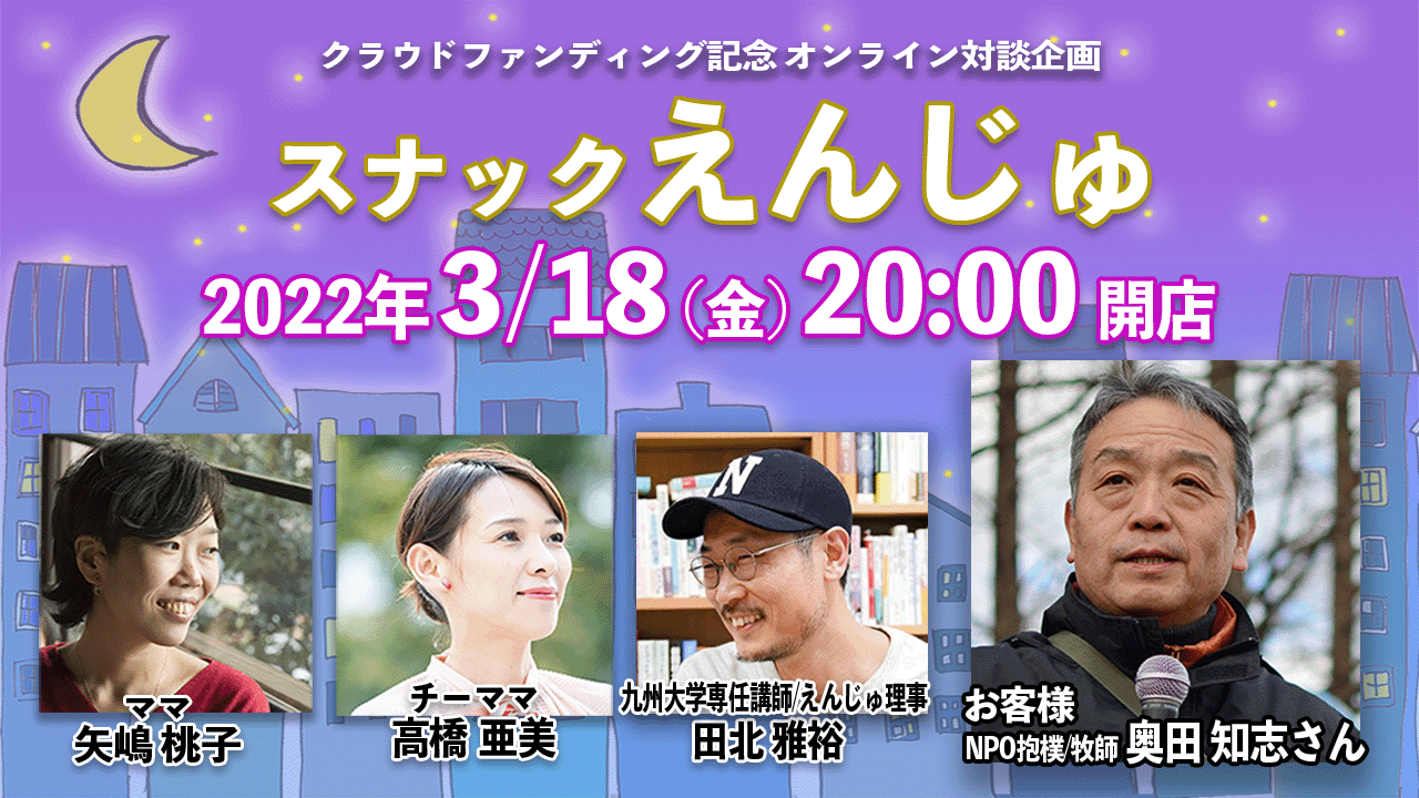 ●スナックえんじゅ ゲスト:奥田知志(抱樸理事長)、田北雅裕(九州大学専任講師/えんじゅ理事/認定NPO法人SOS子どもの村JAPAN理事)