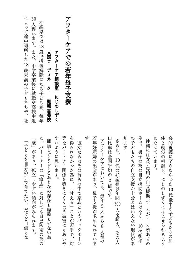 「アフターケアでの若年母子支援」と題したコラムからは、沖縄県内の若年女性の支援の課題を感じていることが伝わってきます。
