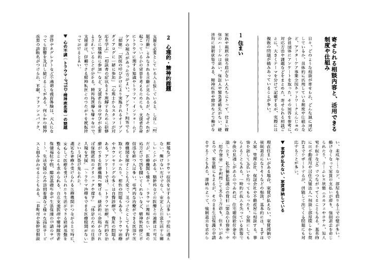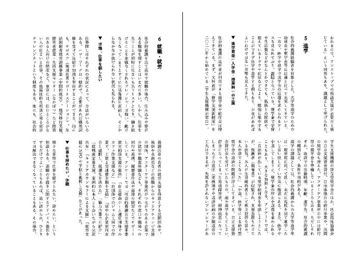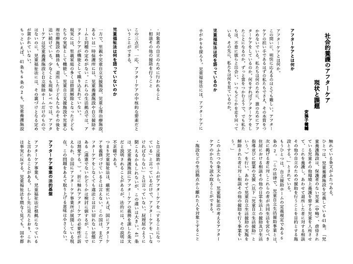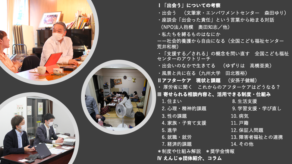 また、「社会的養護のアフターケア 現状と課題」として、現状を概観。「寄せられる相談内容と、活用できる制度・仕組み」として、全国のアフターケア事業所に協力いただいたアンケートを参考にまとめています。