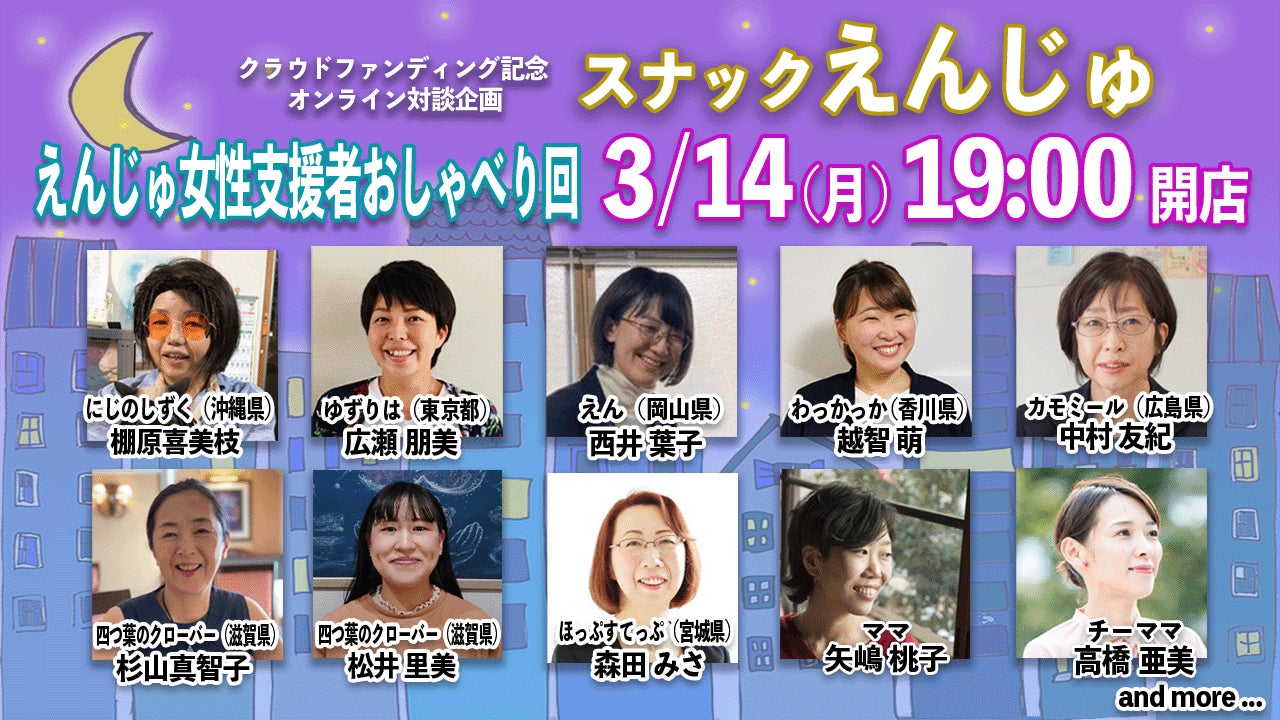 多彩なトークゲストを招いて、アフターケアについて語り合う「スナックえんじゅ」。第3回目のお客様は、えんじゅに参加している全国のアフターケア事業所の、元気な女性支援者たち!「アフターケア事業」という、ある意味とてもニッチでマイナーな分野で日々、奮闘する、パワフルな女性支援者たちのおしゃべりの回です。こんなところがあるんだ、こんな人たちがいるんだと、皆さまにリアルな声を聴いていただき、知っていただけたらうれしいです。ハンドブックの中で原稿を寄せてくださった沖縄の「にじのしずく」の棚原さんには、少し、沖縄という土地の女性支援についても伺ってみたいと思っています。ママ矢嶋桃子(ハンドブック編集長)とチーママ高橋亜美(えんじゅ代表)がお話を伺います。どうぞみなさまも、ゆるっとご来店ください。●スナックえんじゅ ゲスト:*棚原喜美枝さん、松島亜紀子さん(にじのしずく・沖縄県)*西井葉子さん(えん・岡山県)*広瀬朋美さん(ゆずりは・東京都)*杉山真智子さん、松井里美さん(四つ葉のクローバー・滋賀県)*森田みささん(ほっぷすてっぷ・宮城県)*中村友紀さん(カモミール・広島県)*越智萌さん(わっかっか・香川県)・・・他●2022年3月14日(月) 19時〜 を予定しています。▼YouTube配信予定です。https://youtu.be/Vau6zfVla0Eどうぞよろしくお願いいたします!