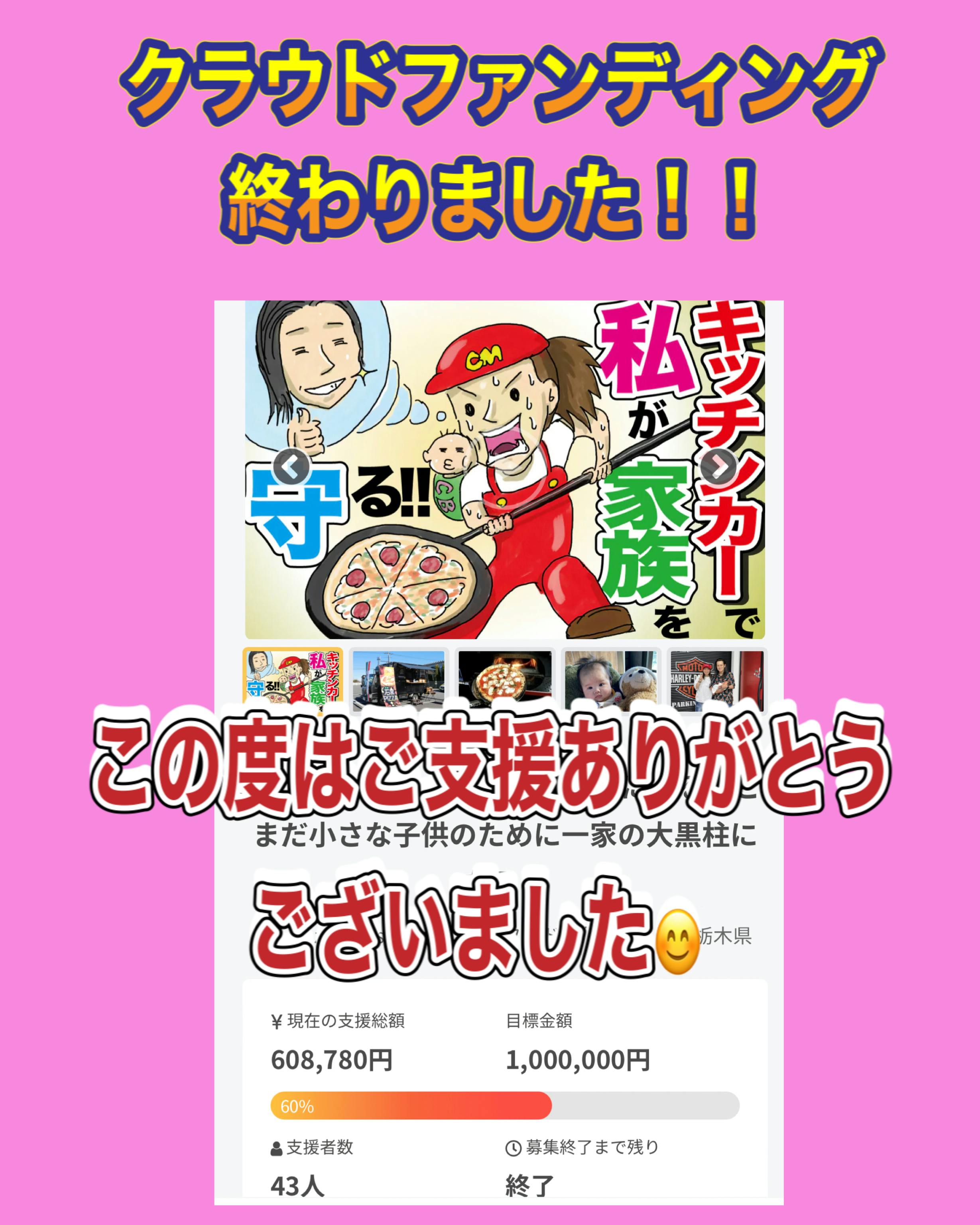 2022/03/01 15:21ここでプロジェクト未達成のお詫びと感謝を伝えさせていただきます。このたびキッチンカー立ち上げプロジェクトを1月27日に立ち上げましたが残念ながら2月28日にクラウドファンディングが終わりましたが目標は達成できませんでした。ご支援を沢山いただきましたが、それを無下にしてしまう結果となり不甲斐ない気持ちでいっぱいです。それでも、こうしてクラウドファンディングを実施することができたのはご支援していただいたみなさんがいたからです。この度はご支援していただき、本当にありがとうございます。もし可能であれば、個別でご支援の感謝を直接お伝えしたいと考えています。お手数ですが以下の野沢連絡先当てに連絡していただけると嬉しいです。facebookやInstagramなどから連絡ください。メールアドレス:crazy.monster225@gmail.comもちろん個人情報等の兼ね合いやご連絡ができない場合もあると思いますので、無理のない程度でお返事頂ければ幸いです。今後の活動についてですがクラウドファンディングは未達成で終わりましたがキッチンカー開業プロジェクトは引き続き活動していきます。それまでの具体的な活動状況については、このInstagramやYouTubeやfacebookなどで活動報告していきます。今回は残念な結果となりましたが今後ともキッチンカープロジェクトを応援していただければとても嬉しいです!!引き続きよろしくお願い致します。2022/3/1野沢 有仁子(のざわ ゆみこ) もっと見る