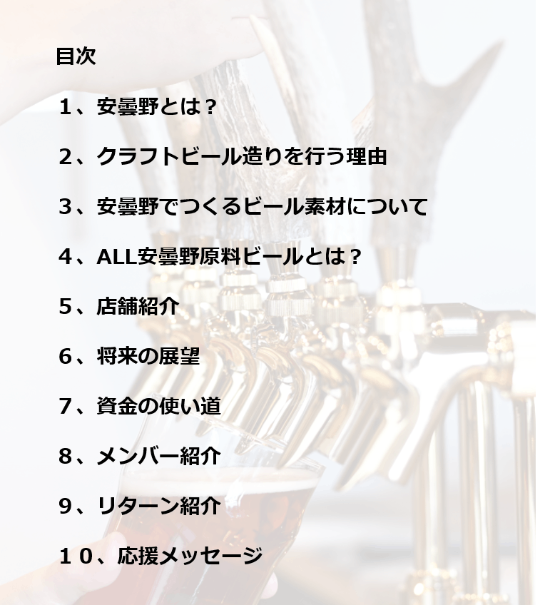日本で初めての取り組みとなる原料から作る自社生産ビール“100%の安曇野産ビール”を作り、ビールを皆さんに味わってもらい、日本国内のクラフトビール事業の火種になることで業界全体を盛り上げたいという想いがあります。
