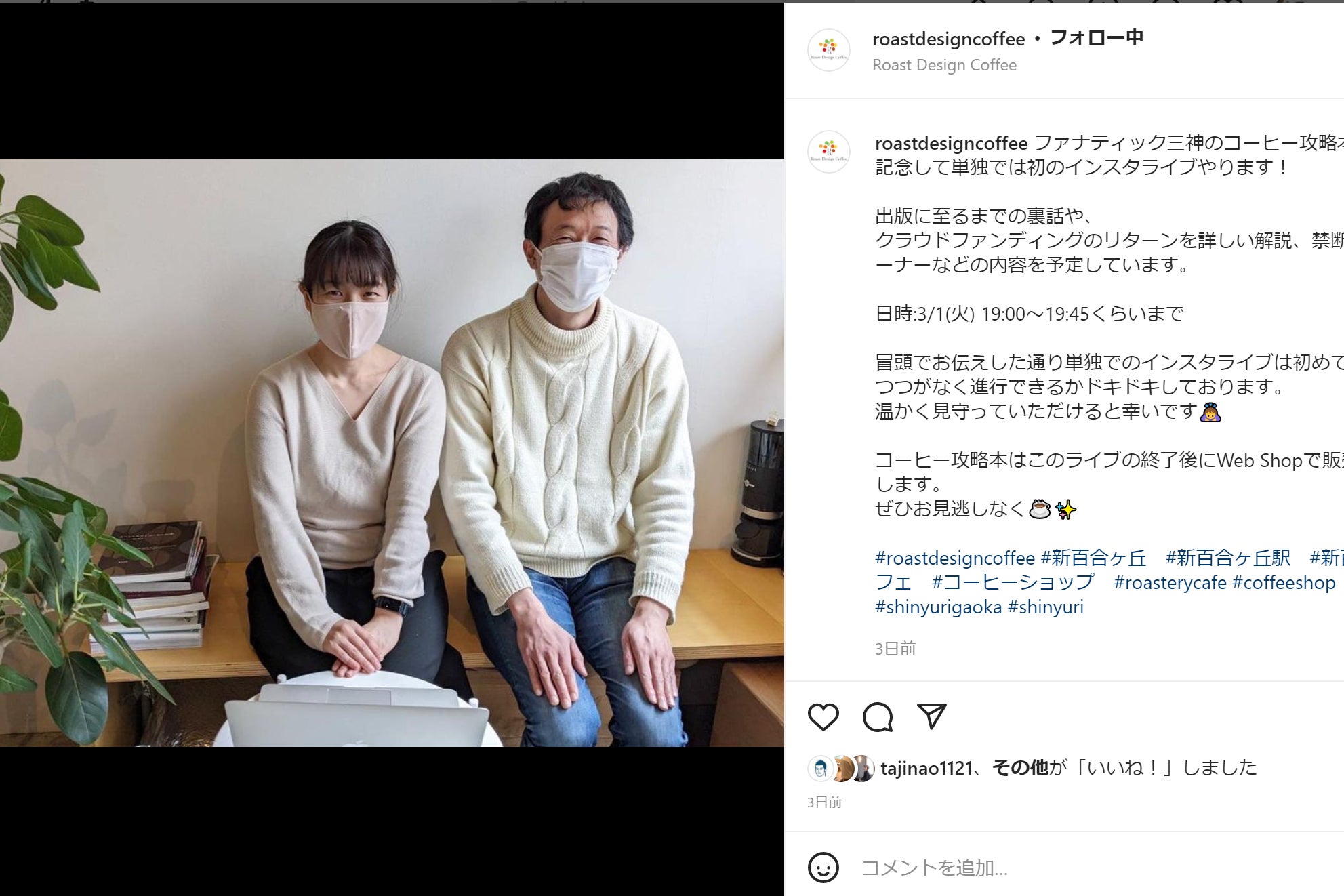 2022/02/26 09:39こんにちは!!Coffee Fanactic三神です!!皆様のサポート誠にありがとうございます!!掲題の件ですが、この度Roast Design Coffeeのアカウントでインスタライブを行う予定です。【日時】3/1日 19:00~https://www.instagram.com/roastdesigncoffee/クラファンのページだけではお伝えしきれない事柄や、リターンの詳細、発送などについてご説明させていただければと思っております(^^)/。ファナティック三神とRDCしゃちょーのご挨拶から始まり、出版に至った経緯、裏話、苦労した点などお話させていただきます!当日は初めての開催のため、グダグダになる可能性がありますが、ぜひ温かい目で見守っていただければ幸いです(笑)。また食レポとして、今回のリターンにも含まれています、”超焙煎=超Roast Design”のコーヒーの抽出実演とテイスティングの模様をお届けします!いままで禁忌とされていた焙煎序盤からの高火力、そして一ハゼ以降も全く火力を落とさない驚きの焙煎です。しかし本書に書かれている通り、必ずしも高火力短時間が生焼けや焦げの原因になる訳ではないです。・・・・というところを頑張って、口頭でお伝えさせていただきます!!それでは当日Roast Design Coffeeのアカウントでお待ちしております! もっと見る