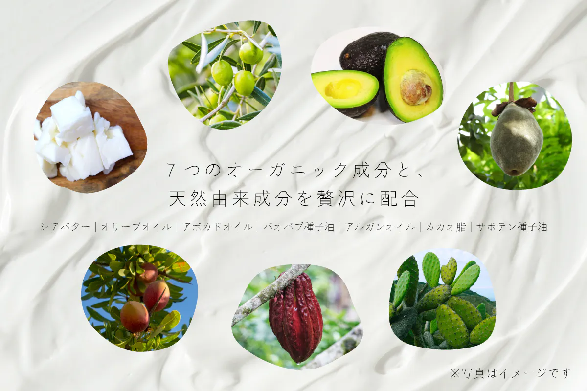 シアバター・オリーブオイル・アボカドオイル・バオバブ種子油・ビタミンEを豊富に含むアルガンオイル・カカオ脂・抗酸化力が高いサボテン種子油などのオーガニック成分配合。
