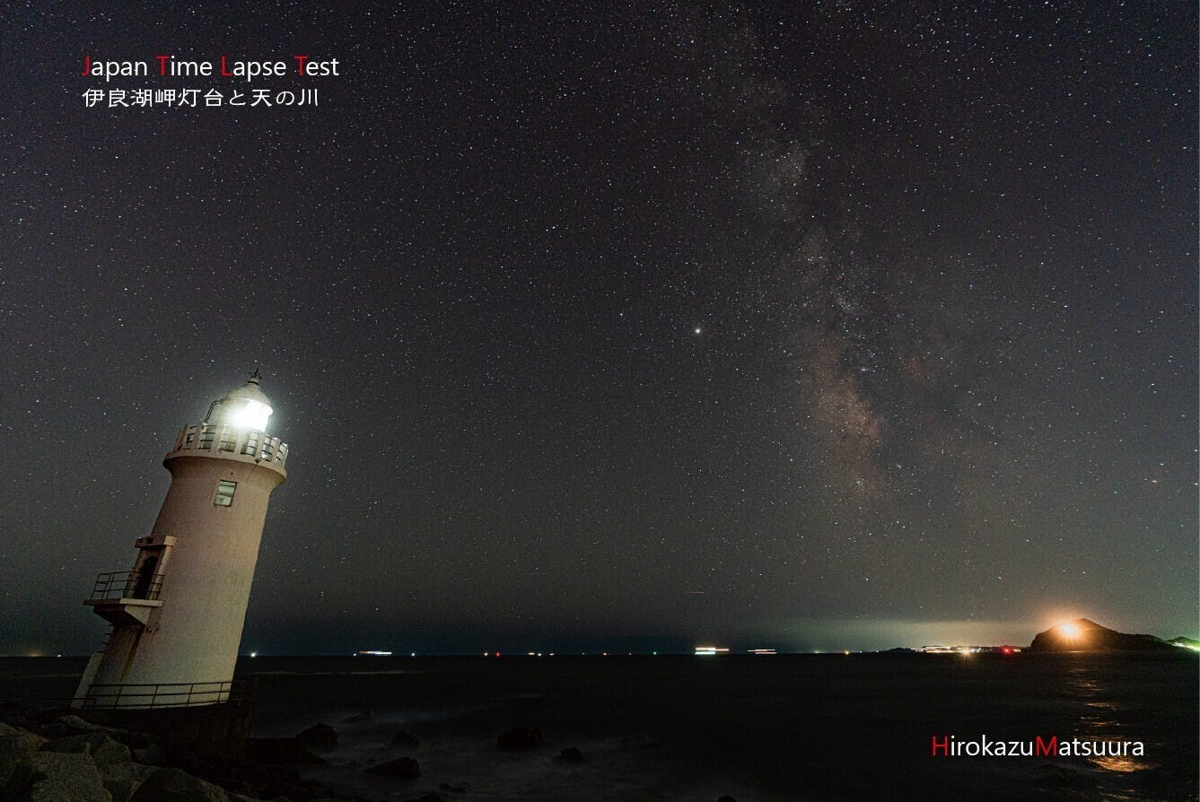 夜になり光を放ち航路標識となった灯台・その灯台とともに眺める満天の星空(天の川)を連続撮影し、タイムラプスという方法で動画制作をしています。