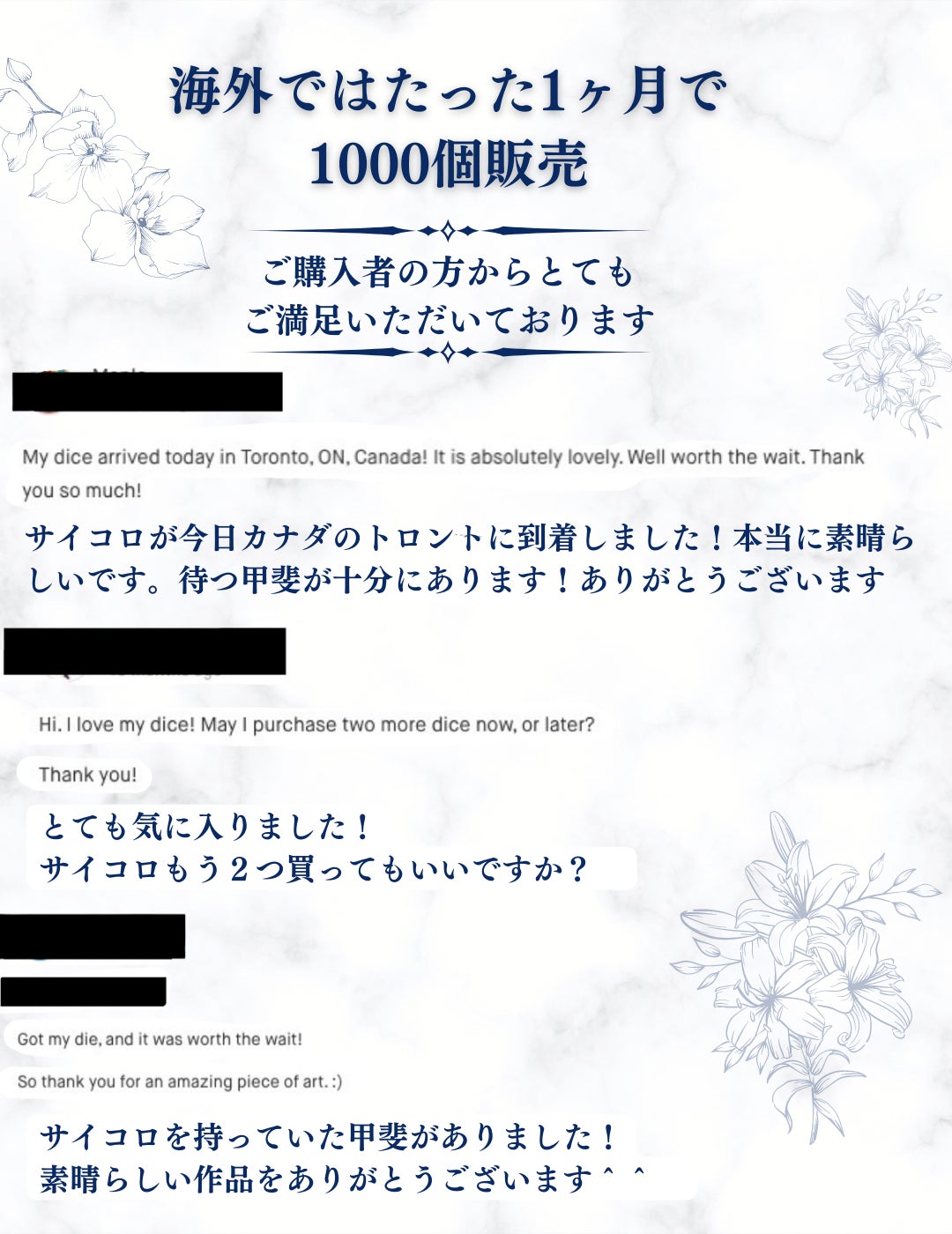2022/03/28 14:49ご支援者の皆様ページをご覧の皆様お世話になっております。皆様のご支援で、目標を大きく超える支援をいただくことができました。本当にありがとうございます。高級陶磁器サイコロですが、残り1日となります。キャンプファイヤー特別価格でのご提供ができるのも明日までとなっております。今後はいつから通常販売をするかまだ未定ですが、販売する際も通常価格での販売になります。ご興味がございましたら、この機会に是非よろしくお願い申し上げます。残り1日なので、高級陶磁器サイコロ【花柄】の1の目の画像で本日の活動報告を締め括りたいと思います。どの目も細部までこだわってデザインしてあります。ご支援者の皆様、商品お手元に届きましたら、是非一面ずつのデザインを見てみてください^^この度は本当にご支援ありがとうございました。そしてご検討されている皆様、こちらのサイコロですが、デザイン性や耐久性など自信を持ってお勧めさせていただける商品になりますので、是非この機会によろしくお願い申し上げます。 もっと見る