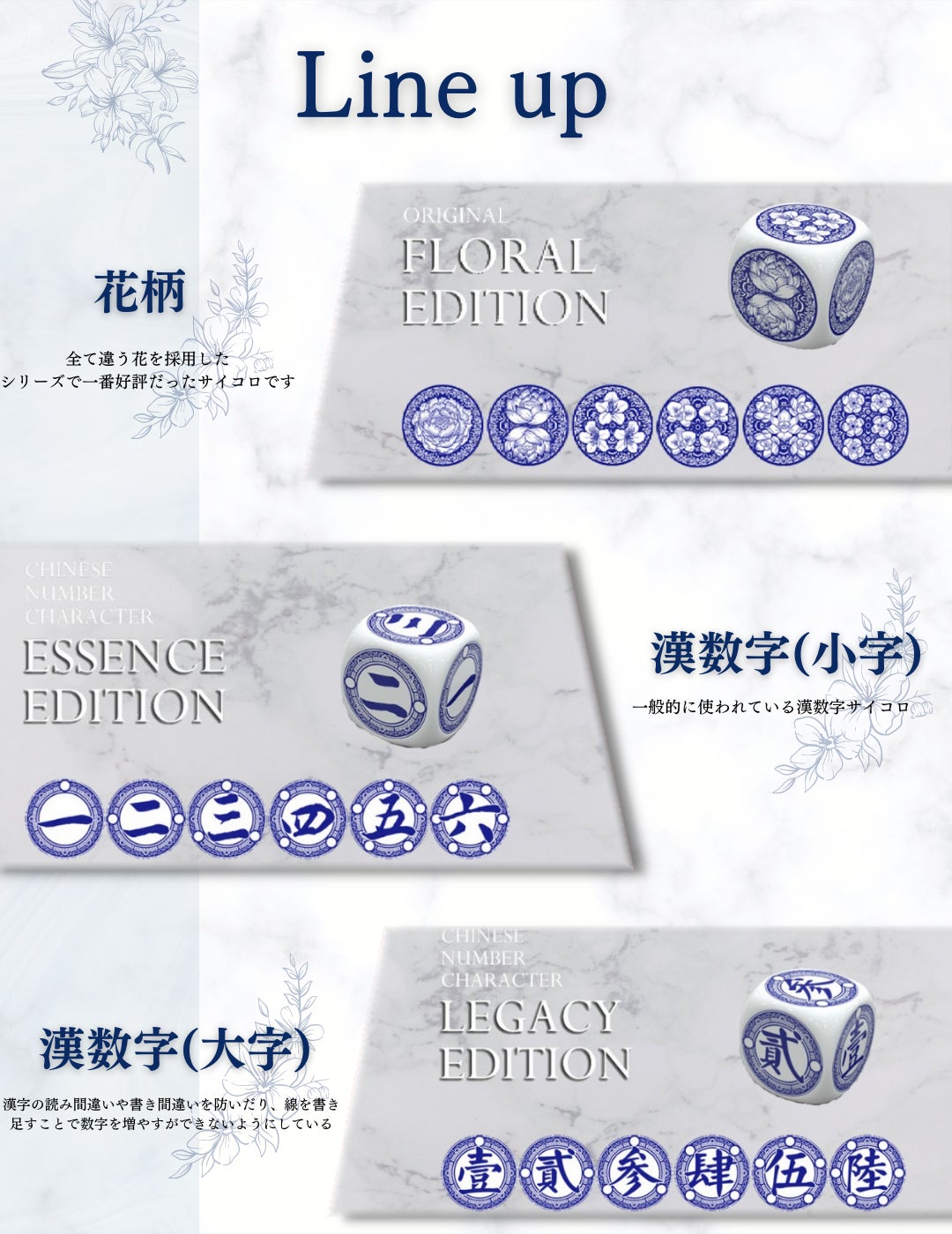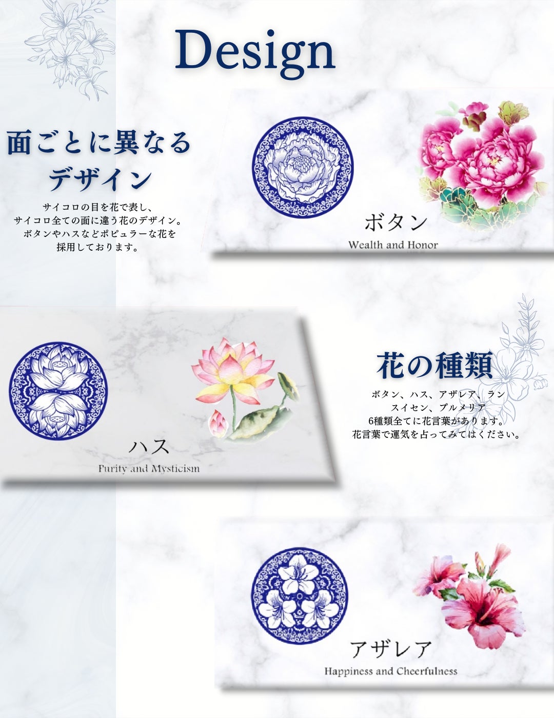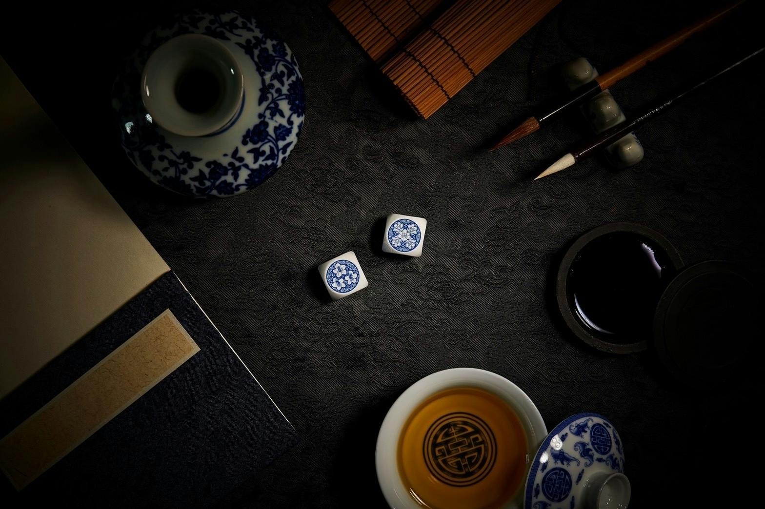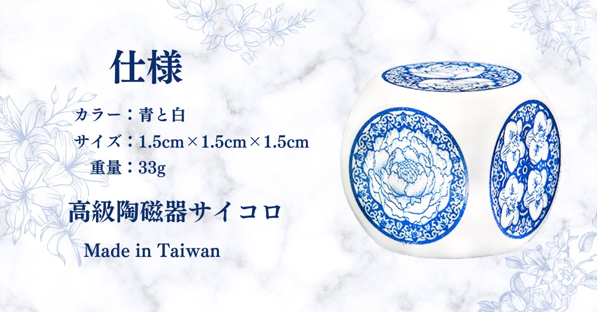陶器は新石器時代から登場し、シンプルな機能性製品から古代の宮廷で使用された芸術作品に至るまで、現代の陶磁器製品は実用性に加えて高水準でエレガントなイメージを維持しています。青と白の陶磁器は高級感を表現するために、プロのイラストレーターを招き、サイコロの模様をデザインしました。サイコロの模様は、美しいだけでなく、数字が明確にわかる必要があります。デザインされている花は伝統の花を6つを選び、それぞれ意味を持っています。