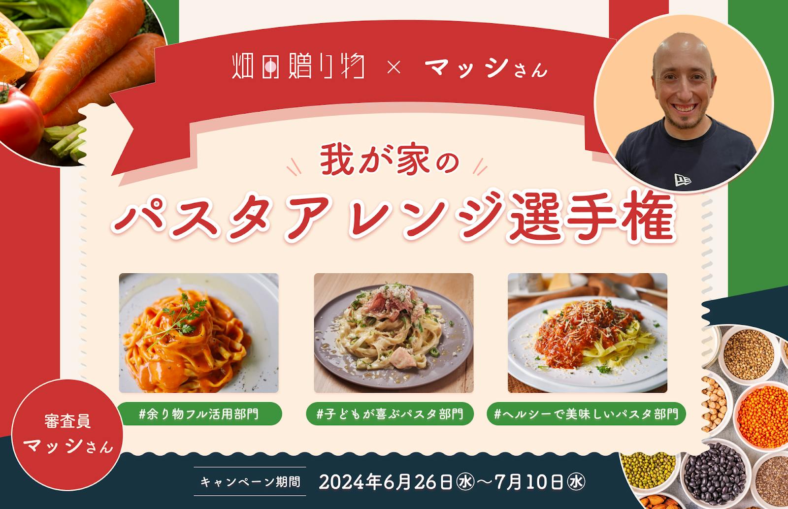 2024/06/28 21:00いつも畑の贈り物を応援してくださっているみなさまへ【お知らせ】みなさんのご支援のおかげで、著名なエッセイスト・マッシさんにご興味を持っていただき、この度コラボが実現しました! 「我が家のパスタアレンジ選手権」を実施中! あなたの創造力を発揮して、オリジナルのパスタレシピをシェアしませんか?今回のキャンペーンでは、以下の3つの部門で優秀作品を選出し、素敵な賞品をご用意しています。①余り物フル活用部門② 子どもが喜ぶパスタ部門③ ヘルシーで美味しいパスタ部門審査員は、サイゼリア完全攻略マニュアルで有名なエッセイストのマッシさんです。彼の視点で選ばれた優秀レシピには、「畑の贈り物」のパスタセットをプレゼントいたします。参加方法はとても簡単!以下の手順でご応募ください。パスタアレンジを考える写真を撮影し、こだわりポイントを書く指定のハッシュタグをつけてX(旧Twitter)に投稿【ハッシュタグ】 #マッシのパスタ #畑の贈り物 #応募したい部門(#余り物フル活用部門 / #子どもが喜ぶパスタ部門 / #ヘルシーで美味しいパスタ部門)応募期間:2024年7月10日(水)まで↓ 詳細は以下のリンクからご確認ください↓[応募方法はこちら]皆さんの素敵なアイデアをお待ちしています! もっと見る最大3,500円OFF!新作パスタソースのプロジェクト開始