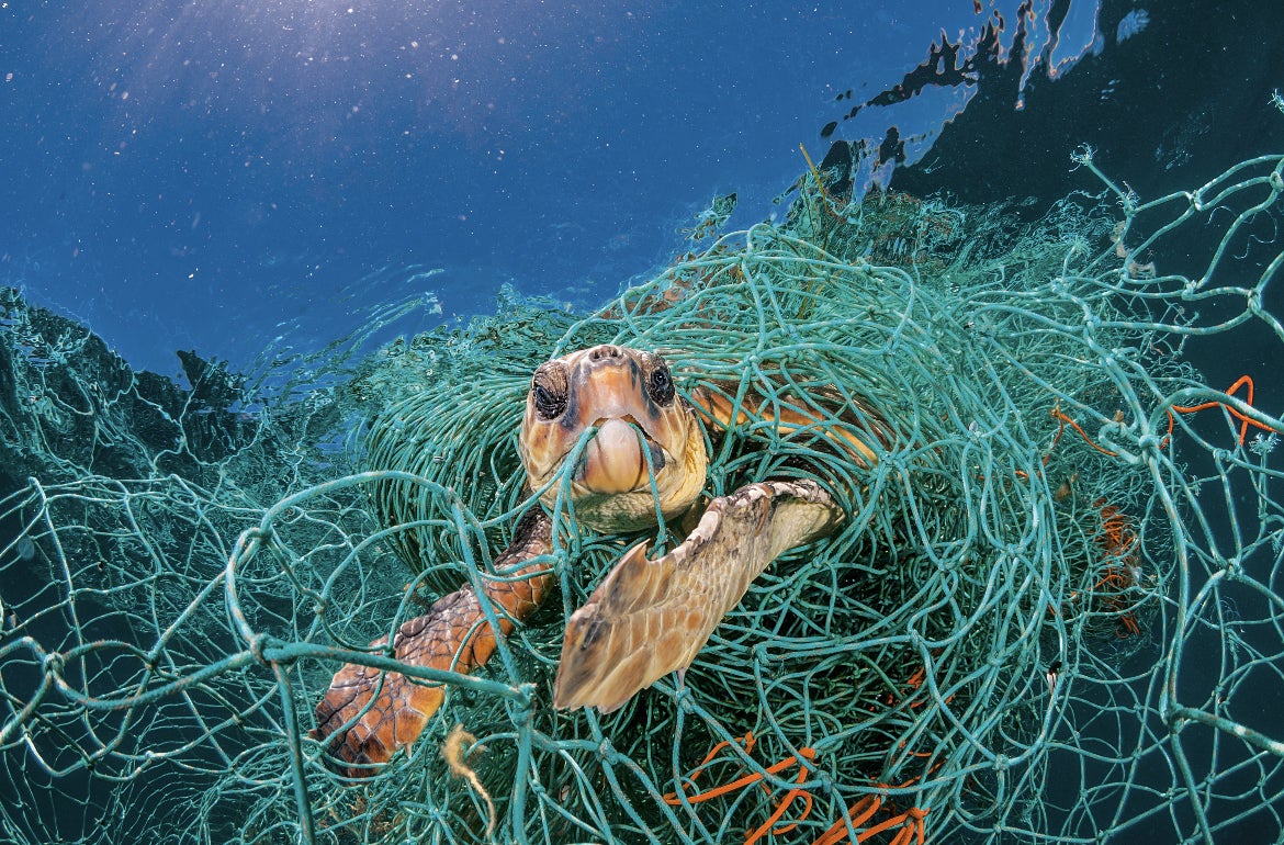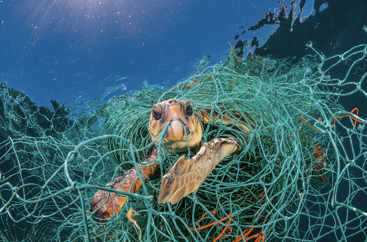 漁網に絡まり息継ぎができないウミガメ(byナショナルジオグラフィックJordi Chias)