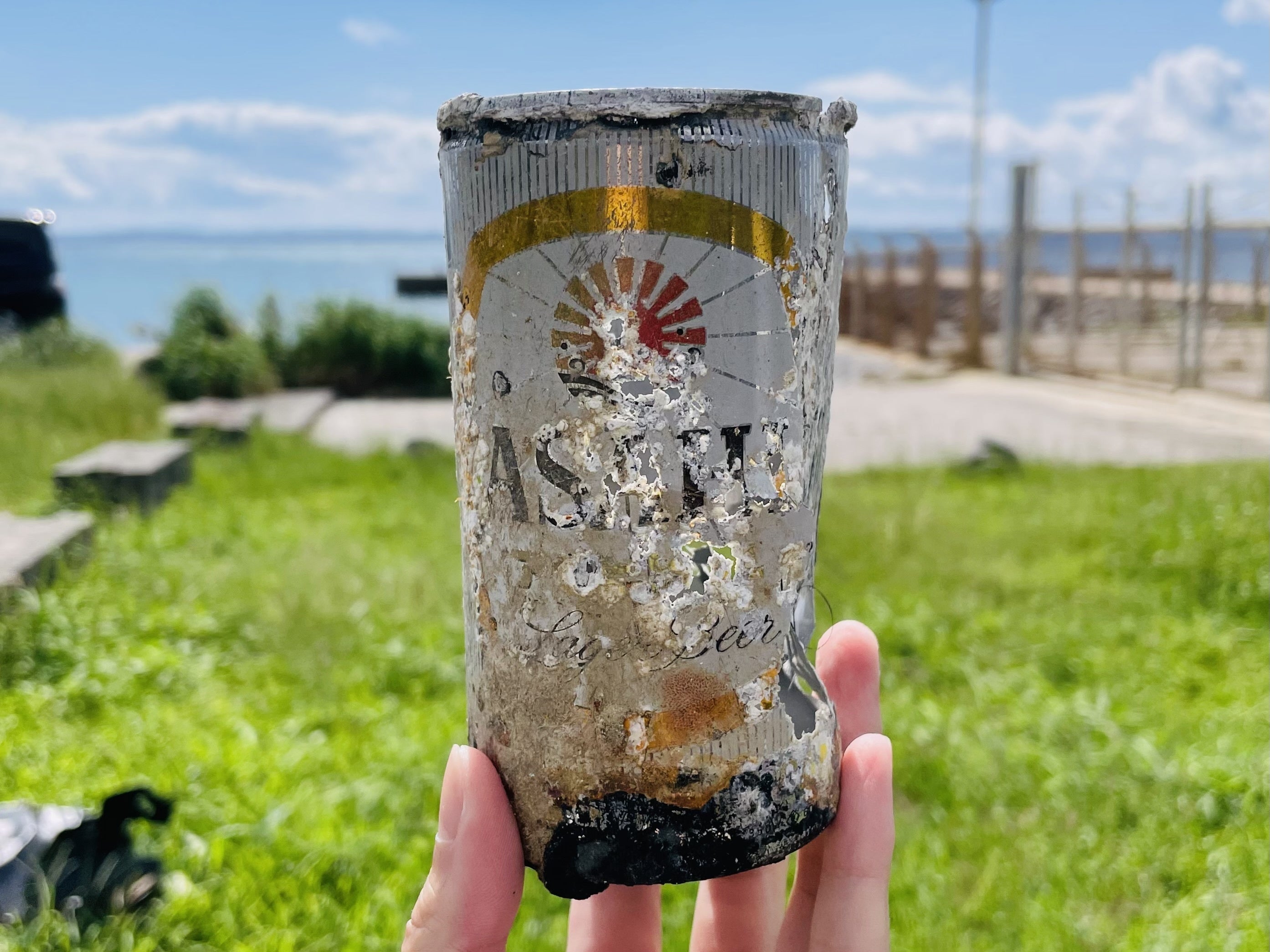 こちらはなんと推定50〜60歳?と思われるアサヒのビール缶です!調べてみたところ、1958年日本で初めて発売されたアサヒビールのデザインでした!やや劣化しているものの、原型やデザインは最低限留めており、半世紀以上海に眠っていたと考えられます。水中ゴミ拾いをして一年、こんなに長寿のゴミと出会ったのは初めてで、何気なくポイ捨てされたゴミがいかに長く海に蓄積されてしまうのか、痛感した1日でした。一方、自分が産まれるより前に捨てられたゴミを発見し拾うということは、なんだかロマンチックにも思えます。年月をかけ、このような状態になってもいまだに海の中で分解されず汚染し続けていることを伝えてくれる貴重なゴミです。