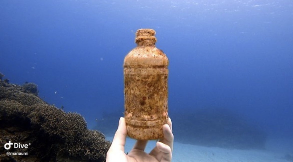 ↑慶良間諸島で発見したペットボトル。こんなに外見が変わってしまっても海に存在し続けます。