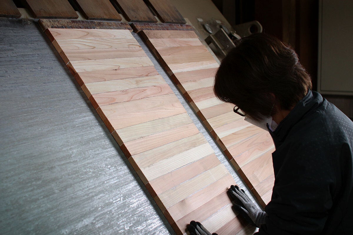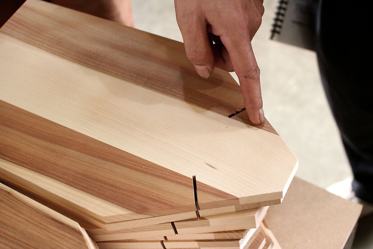 今回使用している北海道産のカツラ集成材は、木表と木裏をそれぞれ交互に合わせて貼り合わせることにより極力反りにくくなるようにつくられています。