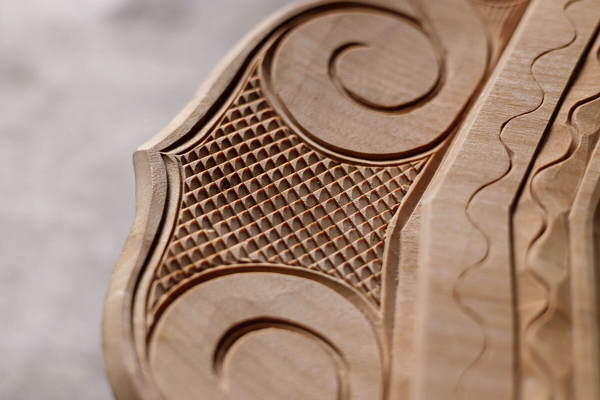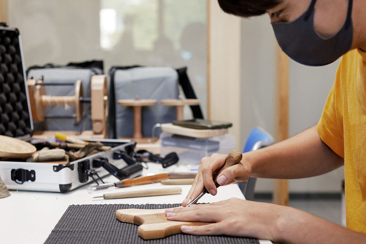 木彫り前の土台はNC加工という機械加工で量産できるよう設計し、現物を見ながら形状の微調整を重ねていきました。機械をプログラミングしながら、その場で数ミリ単位で掘り下げる位置を調整していく様子はまさに職人技です。