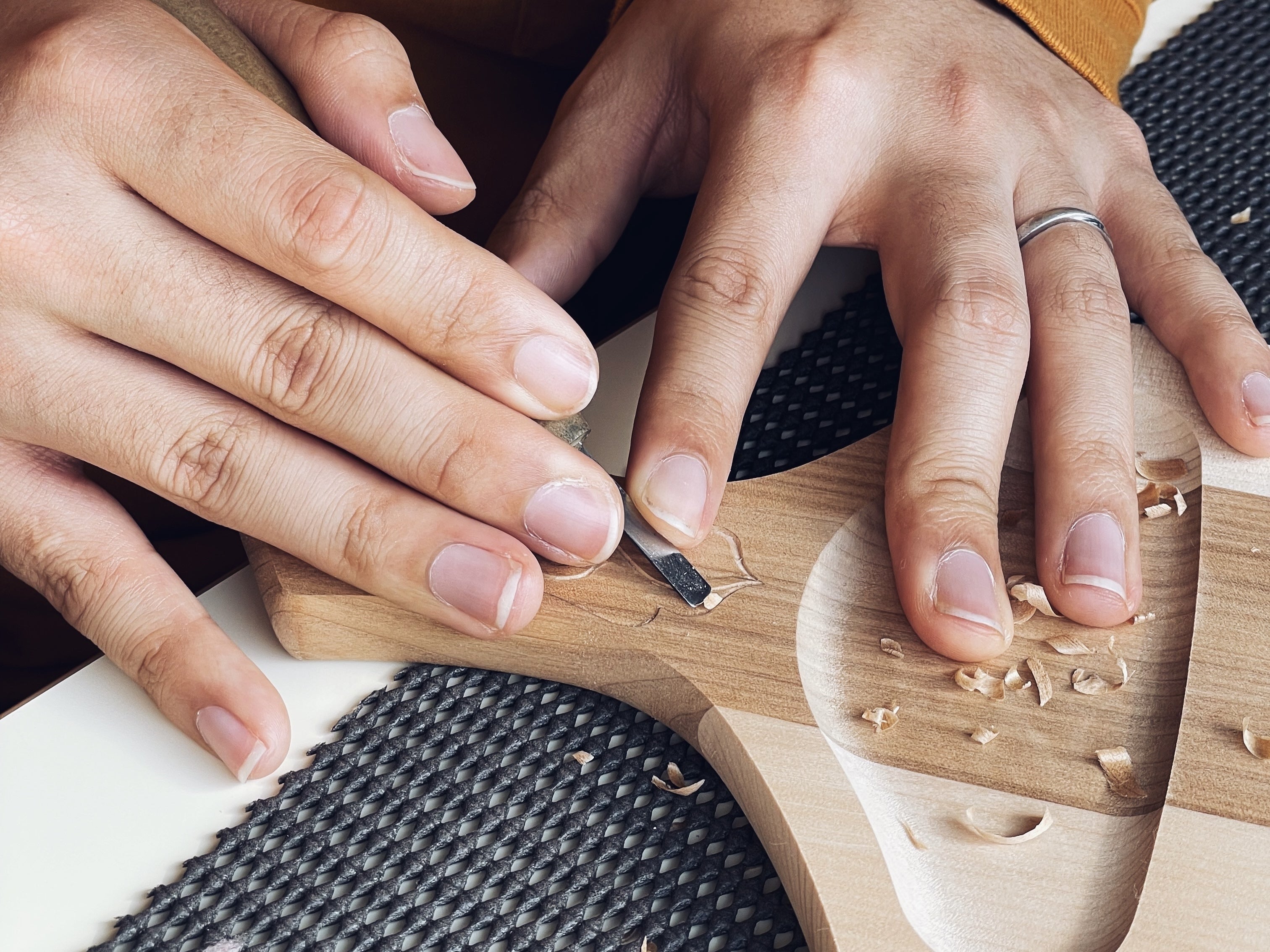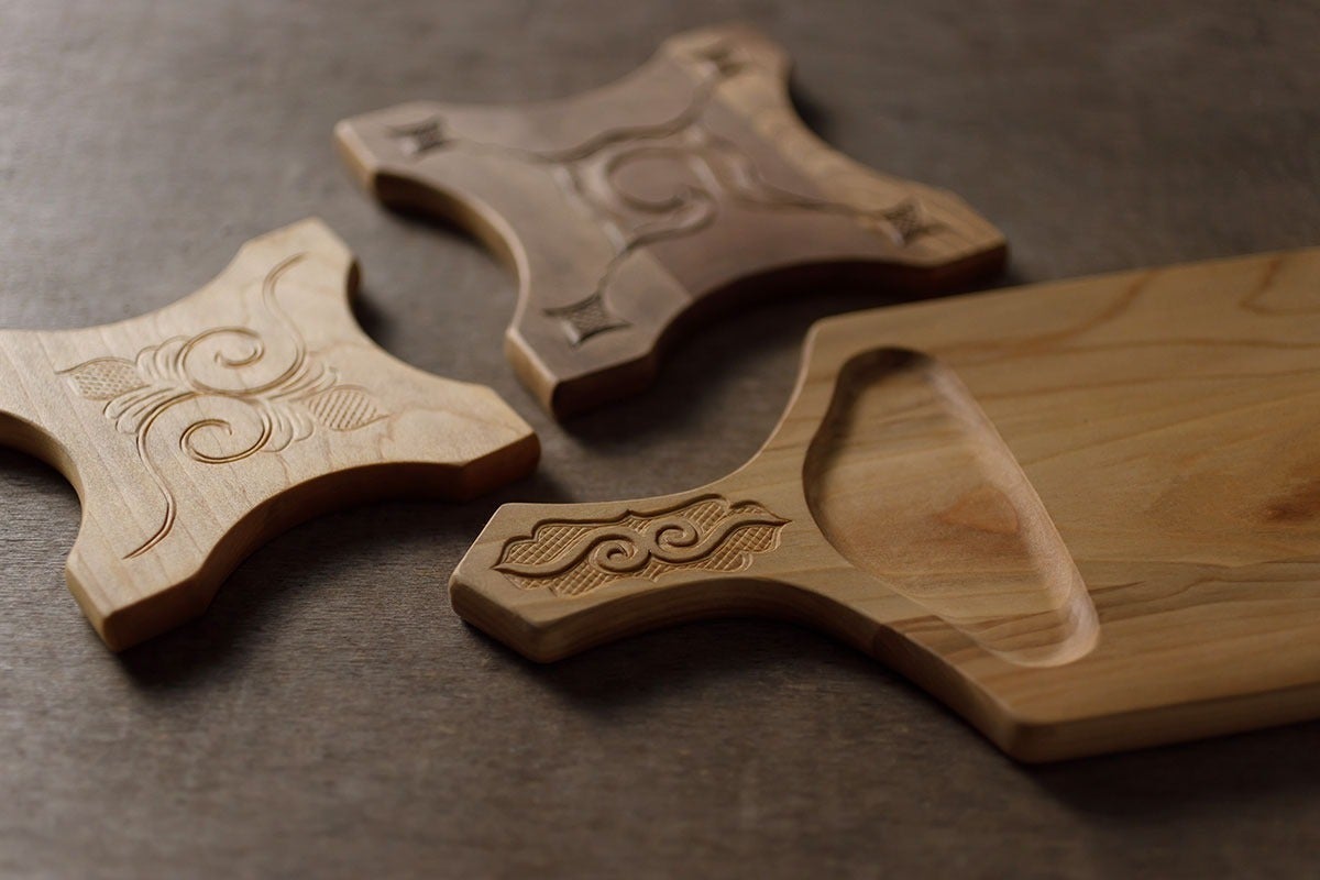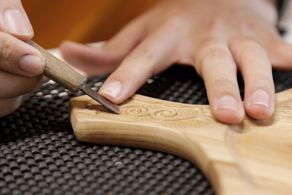 今回のカッティングボードと鍋敷きを作る際に何度も試し彫りをして文様やウロコのバランスを考えながら試行錯誤をして作製しました。木彫りを始めてまだまだ駆け出しですが、人が手に取ったときになにか“こころ”に響くものがあればいいなと思い、自分なりに精一杯作りました。たくさんの人たちの元に届くようにこれからも精進して参ります。