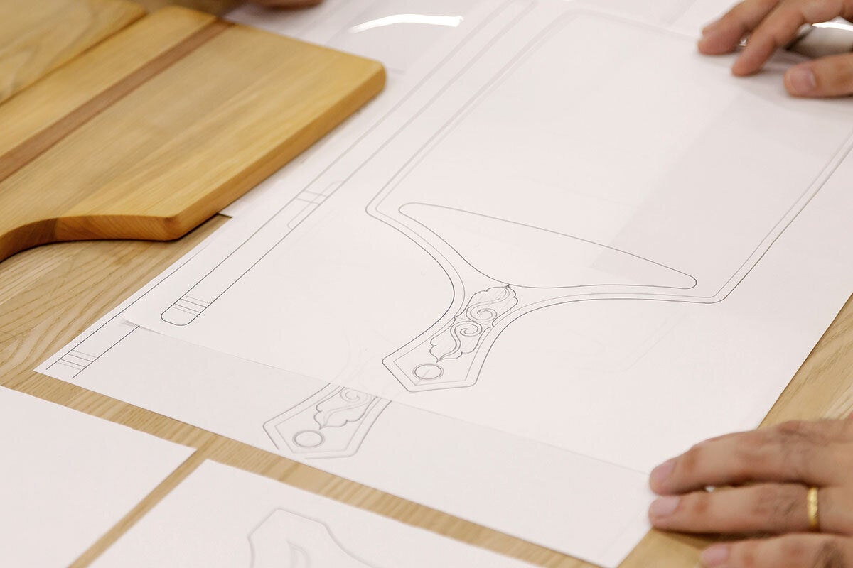 初期のデザインスケッチ。木彫り部分を強調するためにサイズ感や柄の位置などを調整していく