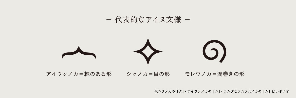 アイヌ文様は、基本となるいくつかの要素を組み合わせてつくり、対称に描かれる事が多いのが特徴です。文様を施した部分と残した部分、そのちょうど良いバランスが美しいアイヌ文様を生み出します。