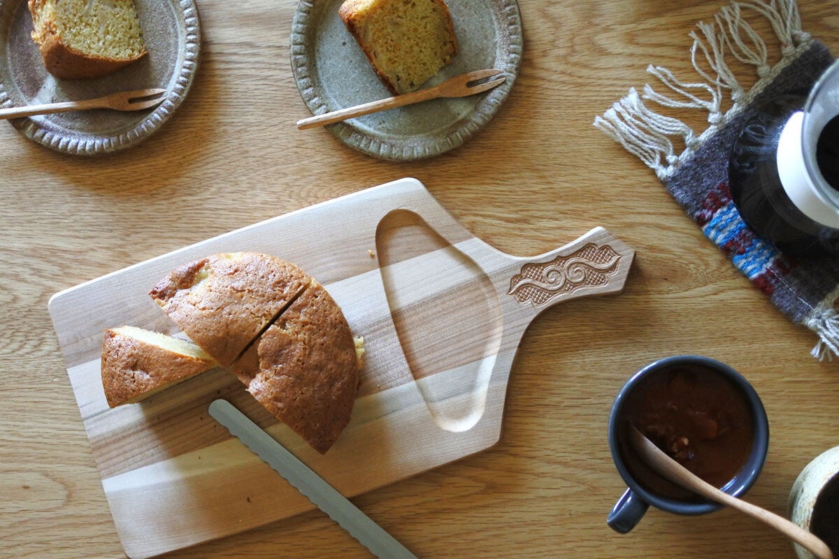 職人が作ったものには何か引かれるものがある。丁寧に彫られたアイヌ文様入りの道具たちの凛とした佇まい…その文様に引き込まれるようで、ただ立て掛けているだけでもキュンとする。カッティングプレートは切るためだけじゃなく、パンやおやつをのせてそのまま食卓に出したり、お肉とスパイスだけだって絵になっちゃう。こういったものは無くても困らないけど、あると日々の生活が楽しくなったり、大切に扱ったり、心が豊かになったり…日々過ごしていくのにとても大事な事だなと思う。