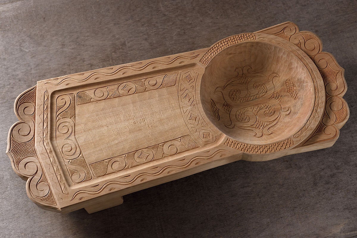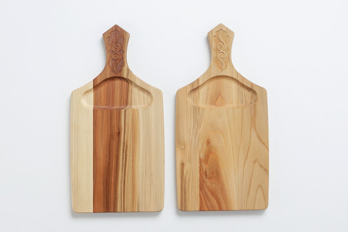 アイヌの人たちが実際に使用していた「メノコイタ」という伝統的な道具は、平らな部分で食材を刻み、くぼみ部分に盛り付けるという、まな板兼ボウルのような役割を果たしていました。小型のものは供応用として用いられ、料理をのせた状態で刃物と一緒に食卓に出し、お客は自由にそれらを切り分けて食べていたそうです。
