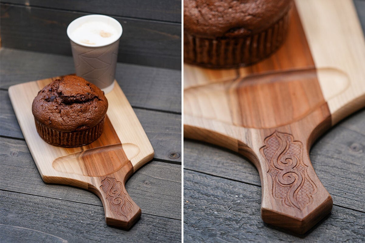 Mサイズのカッティングボードを使ってみました。第一印象は持ち手のアイヌ文様の木彫りがとってもCOOL!職人さんの手がかかってる感じするし、これは長く大事に使いたいアイテムになるよね。そしてボードの凹みにディップやスパイスおけるから便利だし、このアイディアもNICEだね。ん~、北海道のアウトドアにもバッチリな1枚だし、僕のお店でも使いたくなってきたよ!