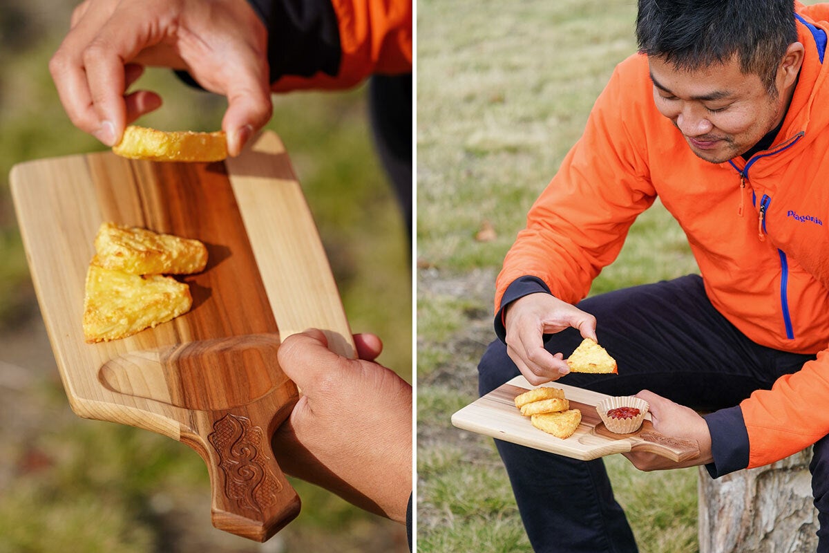 キャンプでの利用する際、ちょっとテーブル越しの相手に食べ物を差し出す時など、カッティングボードを介して渡す事ありますよね?そんな時よく手から滑り落ちたりして事故になっちゃうんですがw、今回のボードには少し凹部があり指をかけたりして持ち運び易かったです。その凹部にはスパイスなど置いても良い感じ。オシャレだけではなくちょっとした機能的な部分もあり使い勝手が良かったです。家でも、アウトドアでもヘビーユースさせて頂きます。