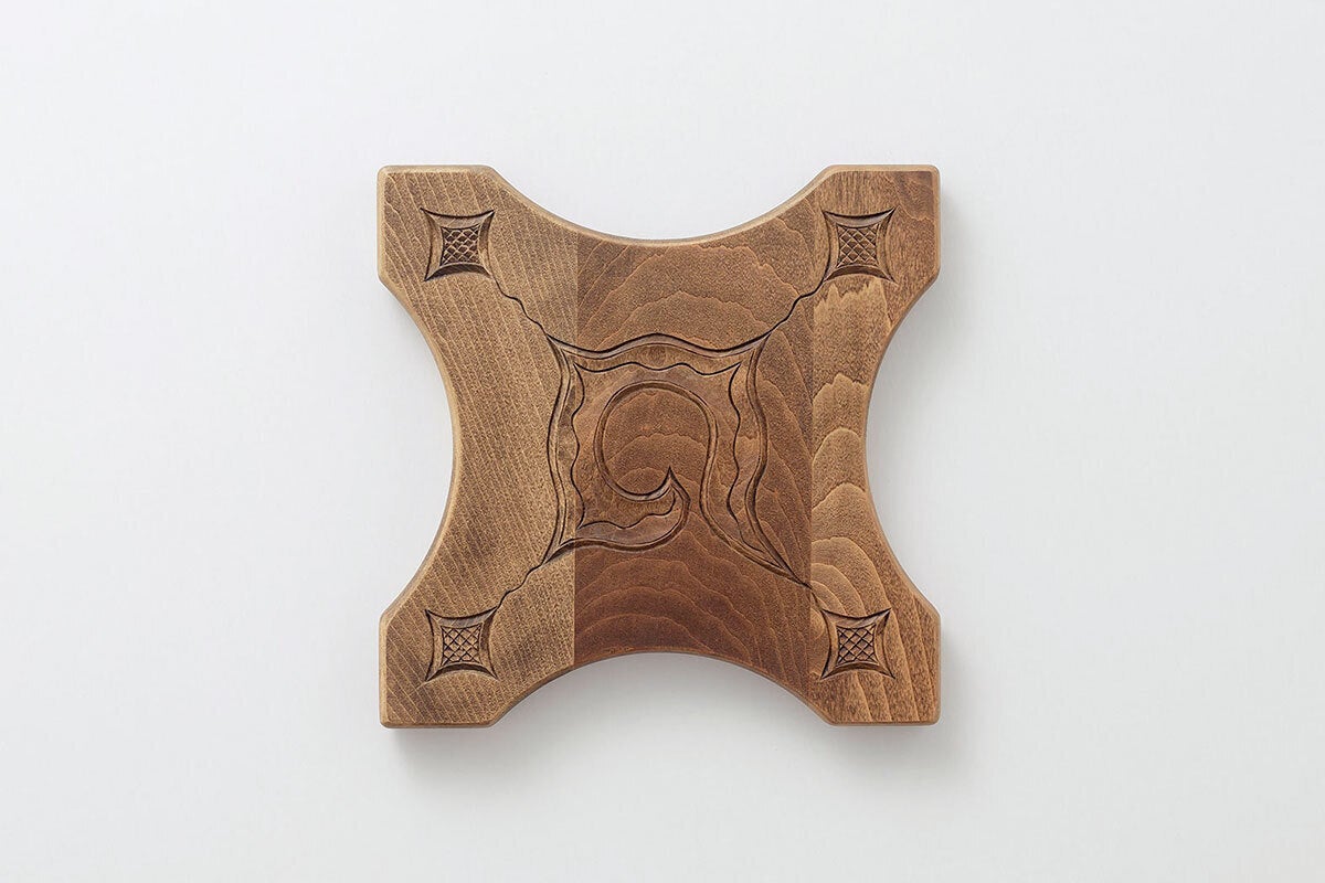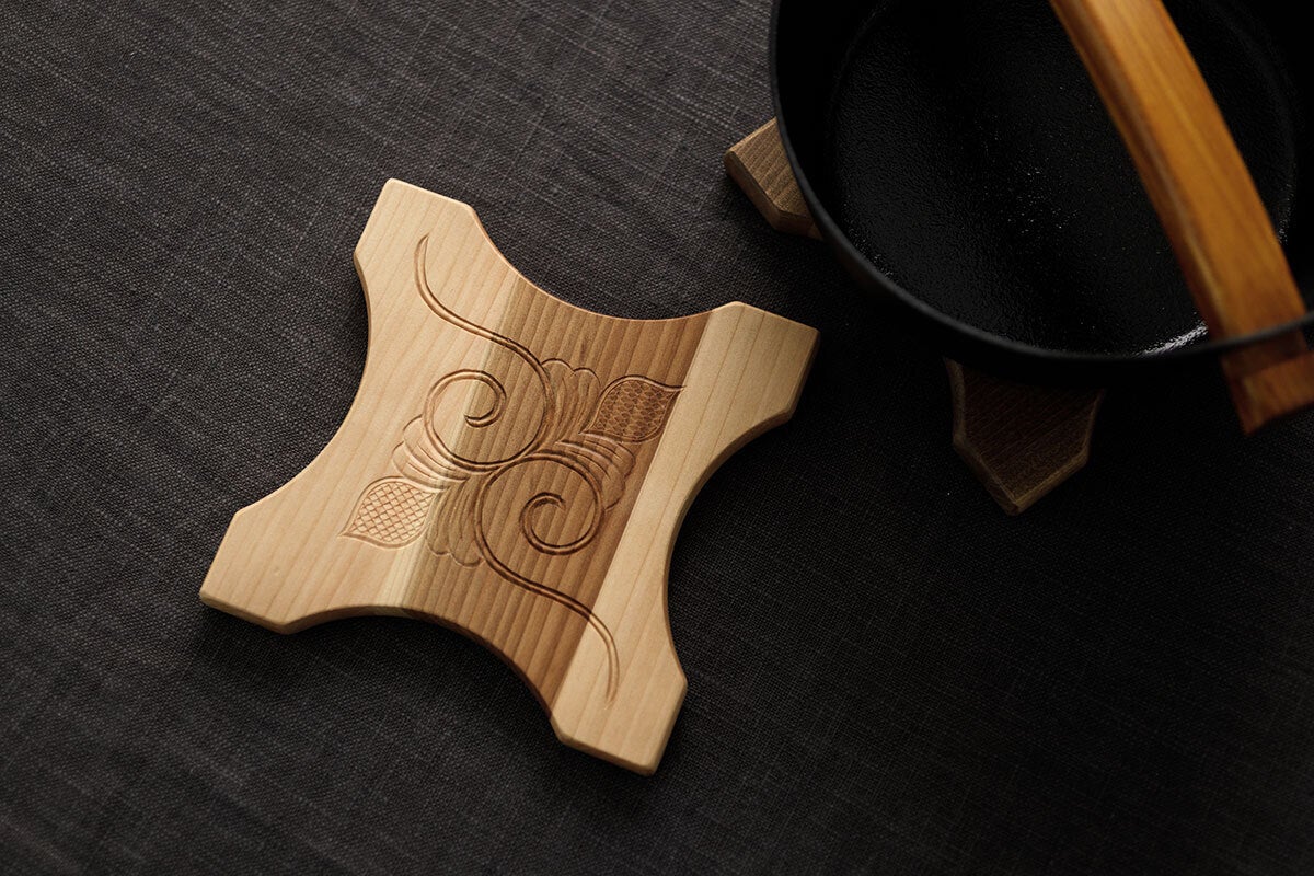 カッティングプレートと合わせて、一緒に使える鍋敷きも作りました。アイヌの伝統的な道具「ヌイトサイェプ」という糸巻きを鍋敷きに見立ててリサイズし、身近な道具へとアップデートしました。