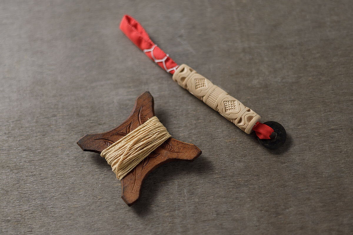 「ヌイトサイェプ」は元々糸巻きとして作られた物なので、糸を巻いてしまうと彫刻が隠れてしまいます。それを分かっていながらも、アイヌの人たちは丹念に文様を彫って大切にしていました。昔のアイヌの人たちが作った道具には、このように機能としては必要がなくとも施された細工が数多く残されています。