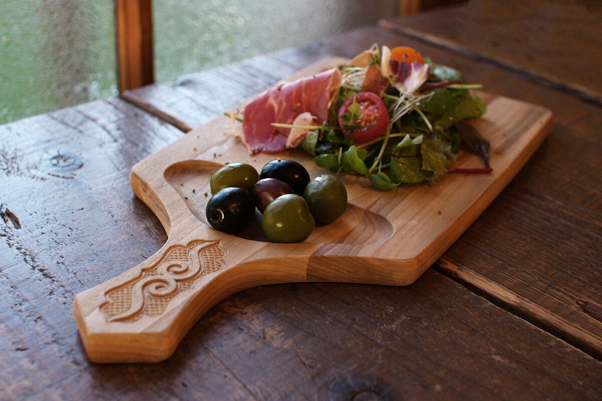 その要素を取り入れ、まな板の形状に合わせて凹みをつけ、プレートとしての使い勝手も考えました。例えば、チーズや生ハムと一緒にオリーブやナッツを添えたい時、メインディッシュに薬味を添えたい時など、くぼみ部分に盛り付ければ、こぼれ落ちることを防いでくれます。まな板として広い面積を使いたい場合は、裏面を使用することもできます。