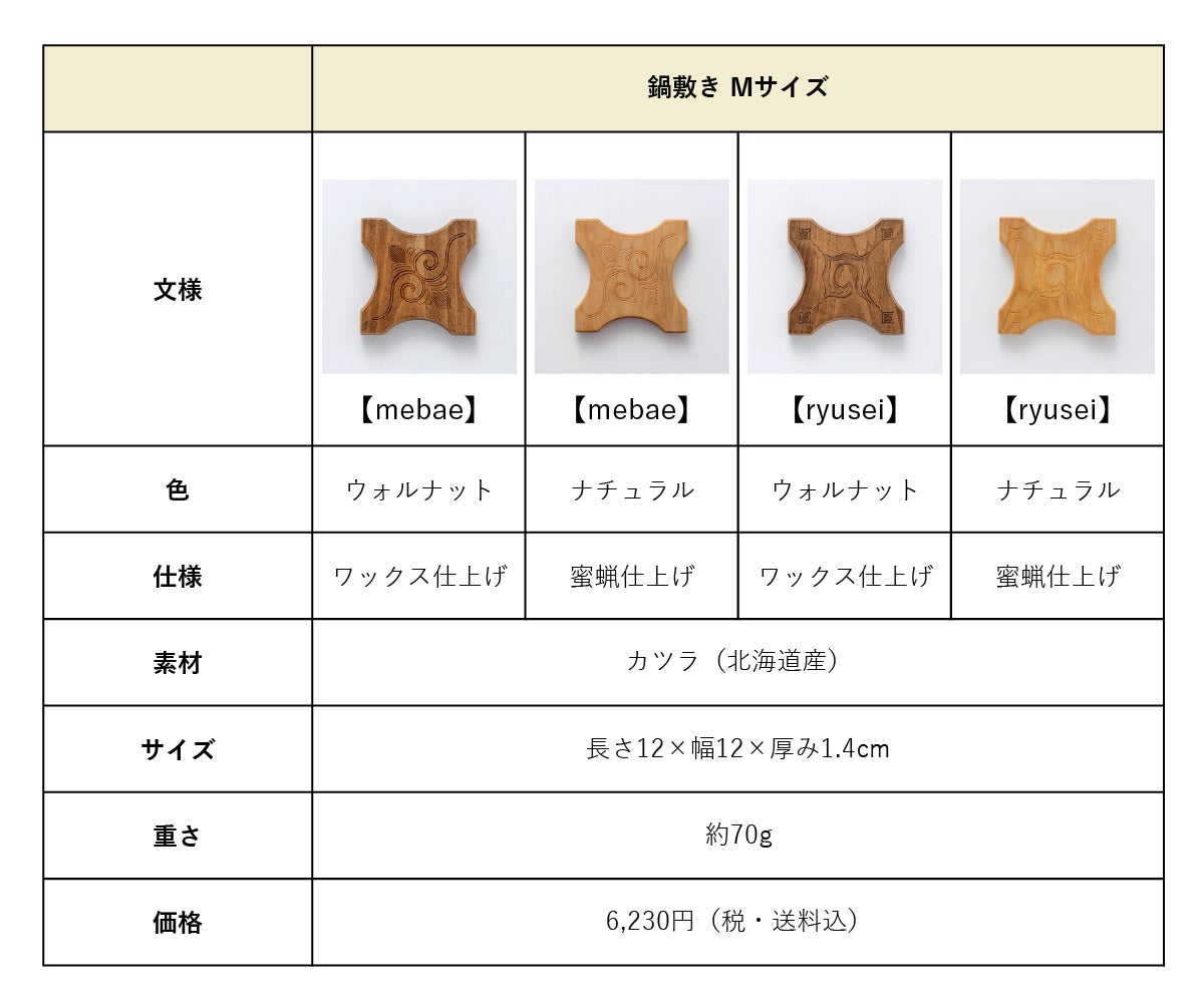 天然素材のためお使いいただくうちに色や風合いが変化していきます。鍋敷きは熱い鍋やフライパンなどをのせると焦げ目がつく場合がございますが、アイヌ文様もまた違った表情になっていきますので経年変化としてお楽しみください。