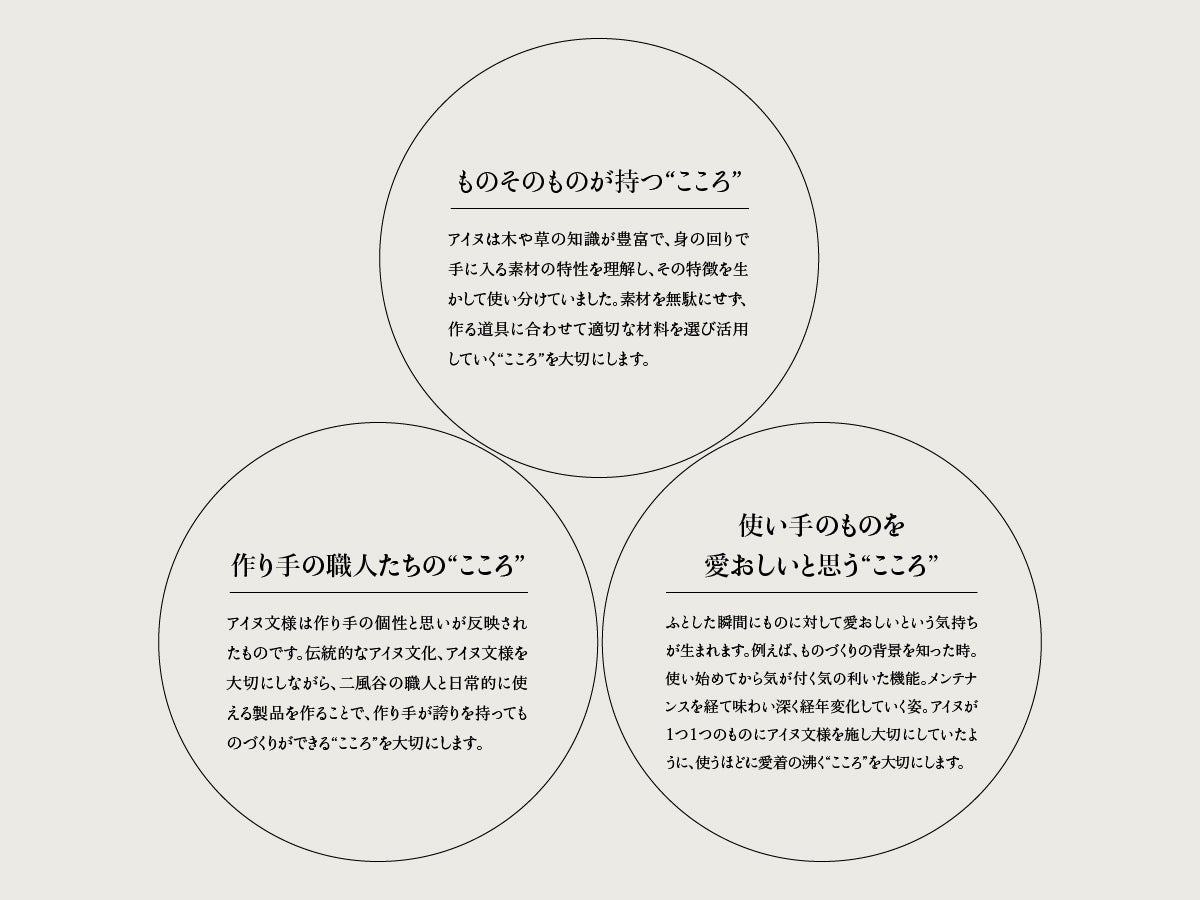 ふとした瞬間にものに対して愛おしいという気持ちが生まれます。例えば、ものづくりの背景を知った時。使い始めてから気が付く気の利いた機能。メンテナンスを経て味わい深く経年変化していく姿。アイヌが1つ1つのものにアイヌ文様を施し大切にしていたように、使うほどに愛着の沸く“こころ”を大切にします。