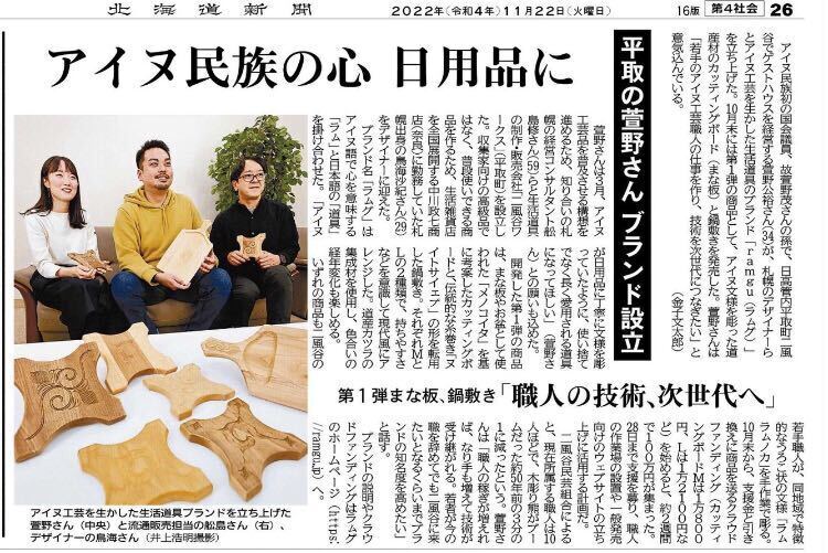 SNSの方ではお知らせ致しましたが、先日11月22日の北海道新聞(全道版)に私たち二風谷ワークスの取り組みを掲載いただきました。