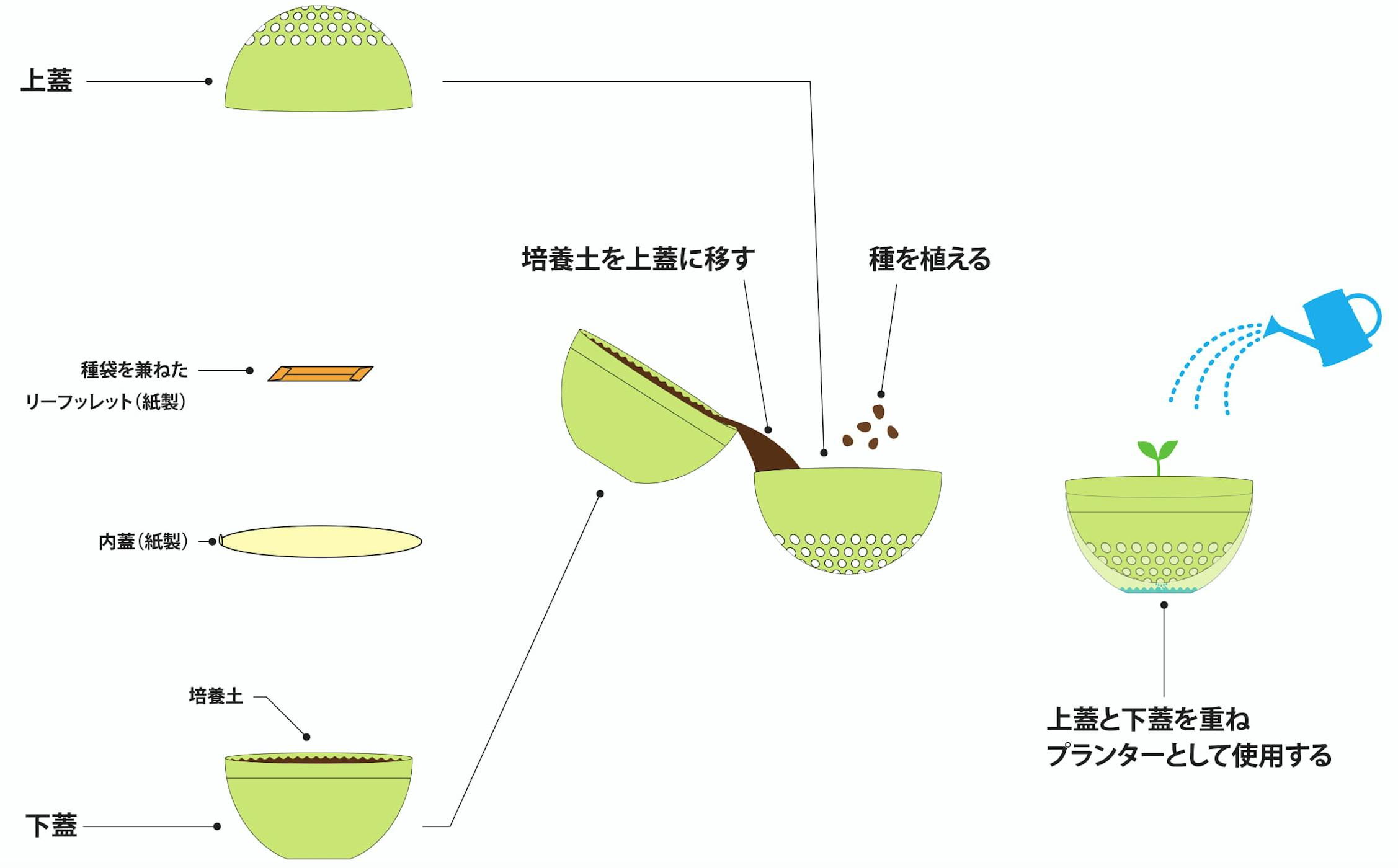 増え過ぎて困っている植物を主原料としたカプセルに、減少している植物の種をパッケージングした植物育成キット。