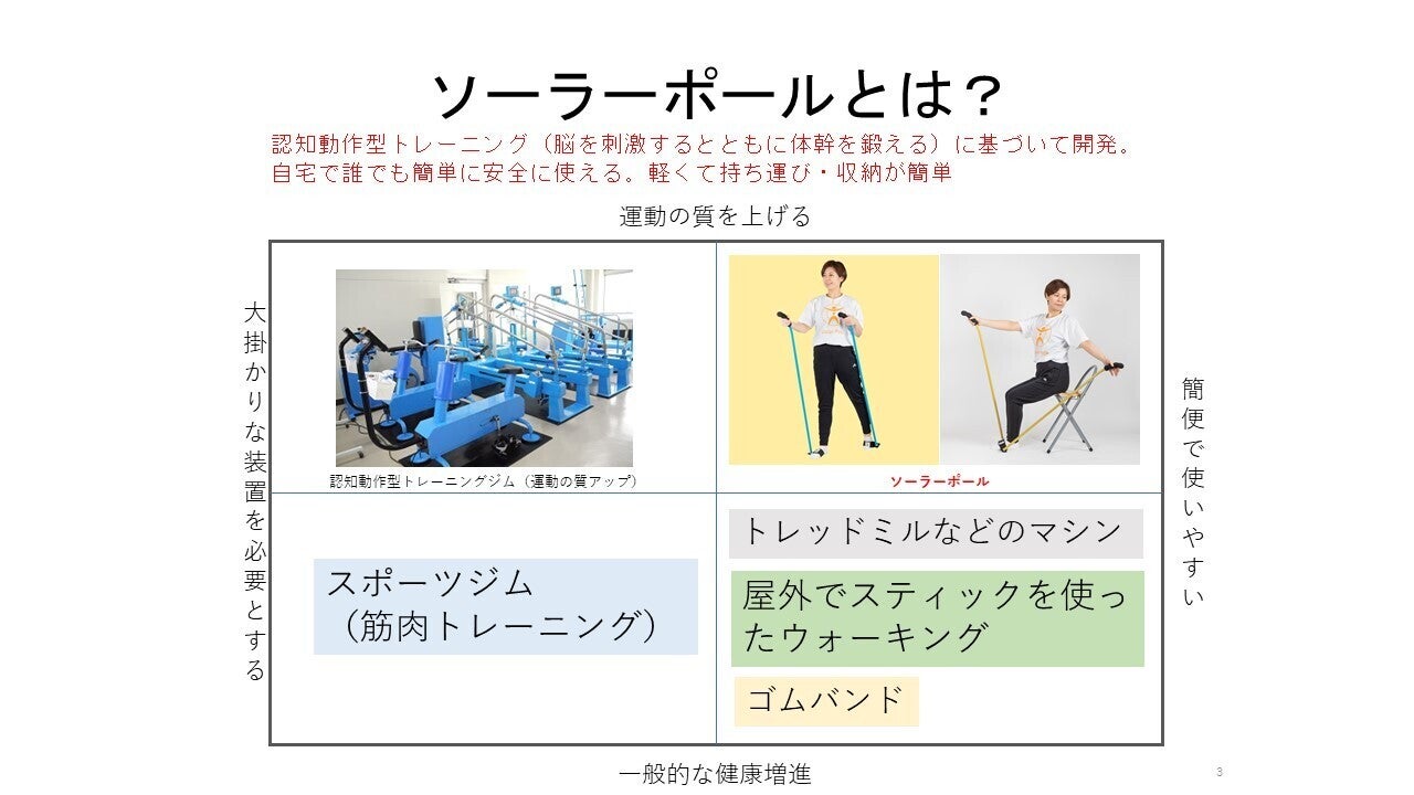 ソーラーポールを開発したのは、健康寿命を伸ばしてピンピン転ばない人生を皆さんが送って頂ければ、活力ある社会になることを確信したためです。