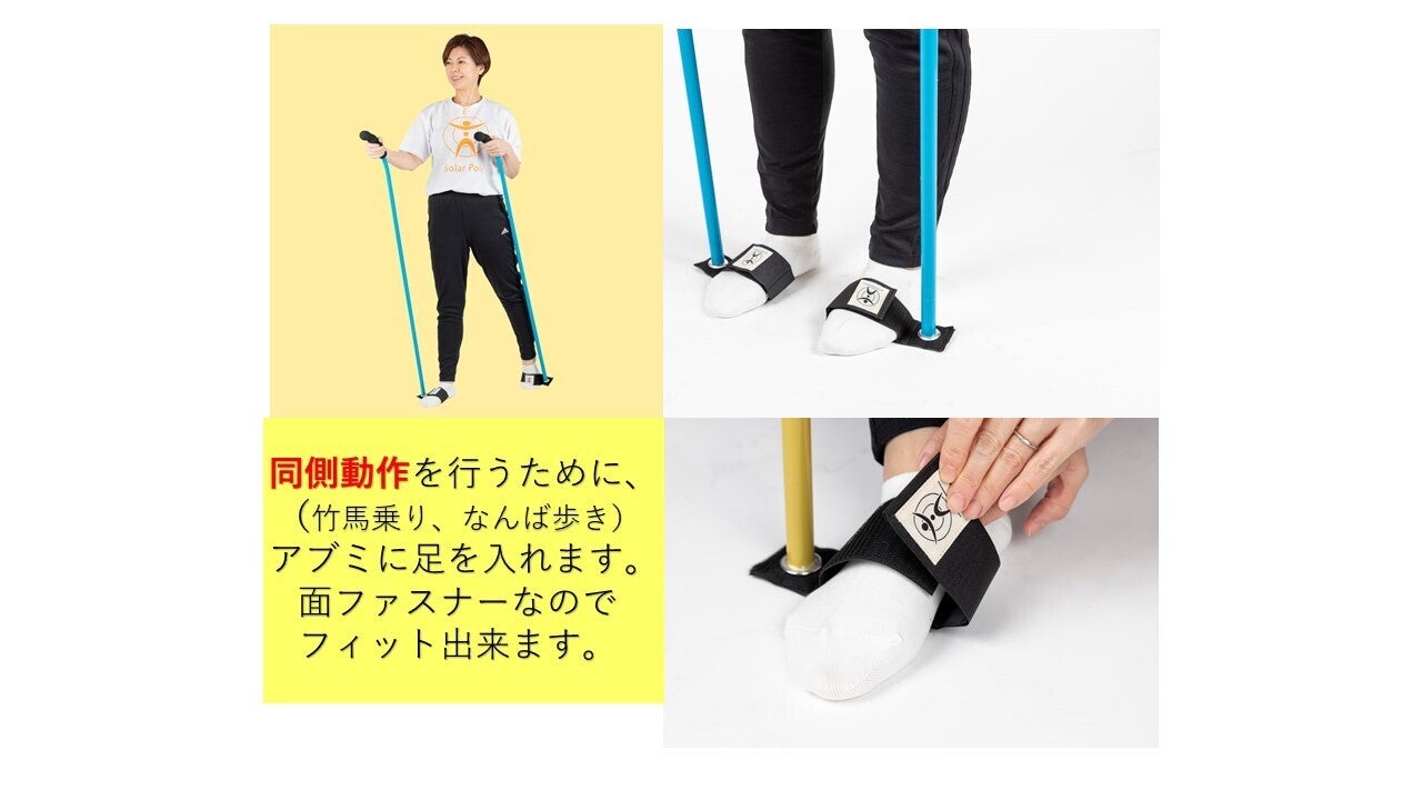 アブミがソーラーポールの他の製品とは全く異なる大きな特長です。同側動作は右手右足、左手左足を同時に動かすことで体幹を鍛え大腰筋などの腸腰筋を鍛えることが出来ます。なお、足の形、大きさは個人差があるので面ファスナーでフィットできるように工夫しています。是非お試し頂ければ、その効果がすぐに体感できます。是非ご検討ください。