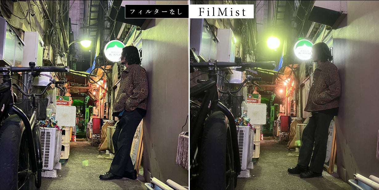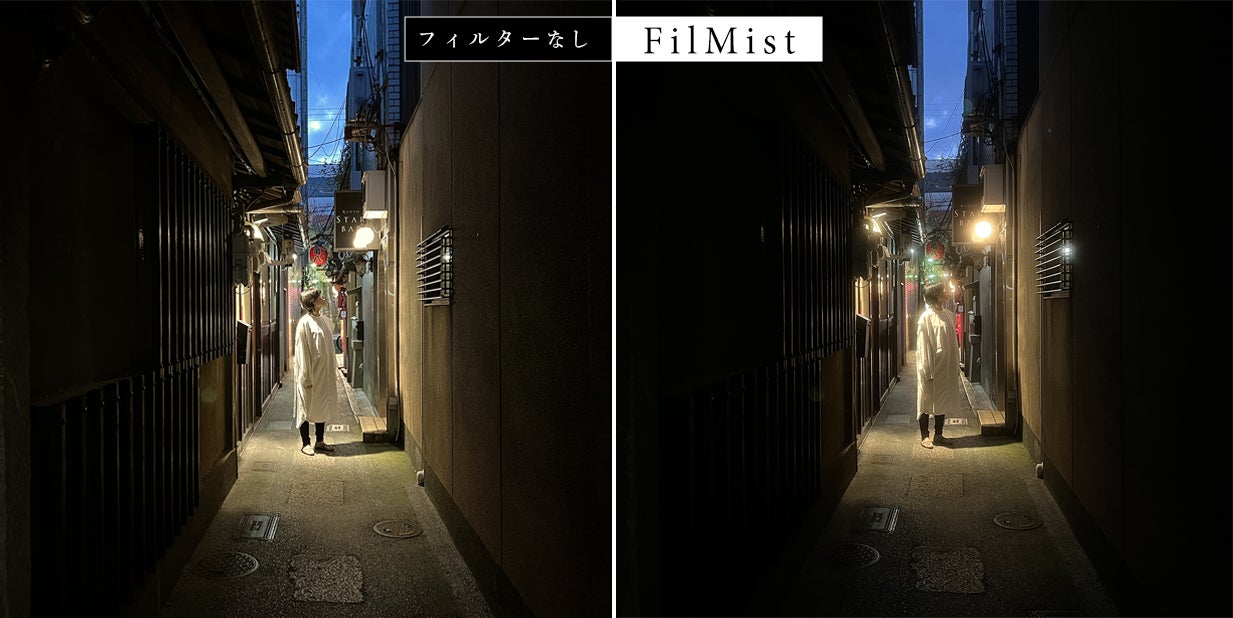例え暗い場所でも、わずかに見える光をFilMistで捉えることで、その1枚の印象は「冷たさ」から「温かさ」に。