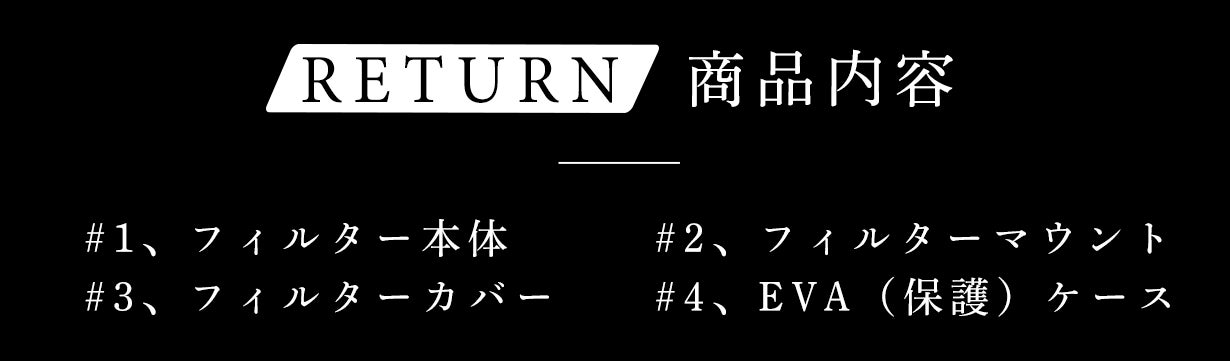 今回、皆様へのリターンとしてご用意したのは、FilMist 1/2フィルター本体に、専用フィルターマウント・専用レンズカバー・専用EVAケースを加えた4点パッケージ。
