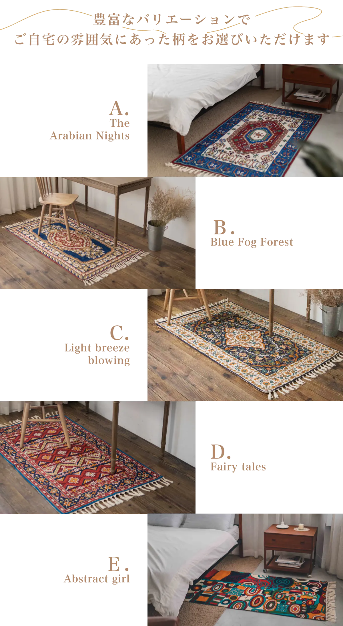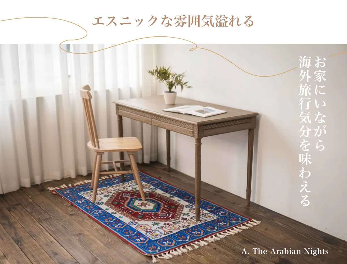 ラグを敷くだけで、異国情緒が溢れる空間を再現。 触り心地もよく、ラグとしてはもちろん、壁掛けやヨガ・瞑想などにもお使いいただけます。