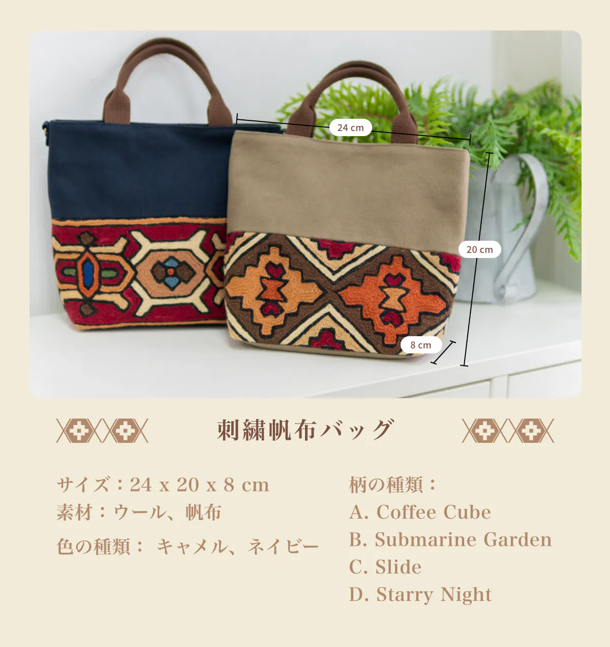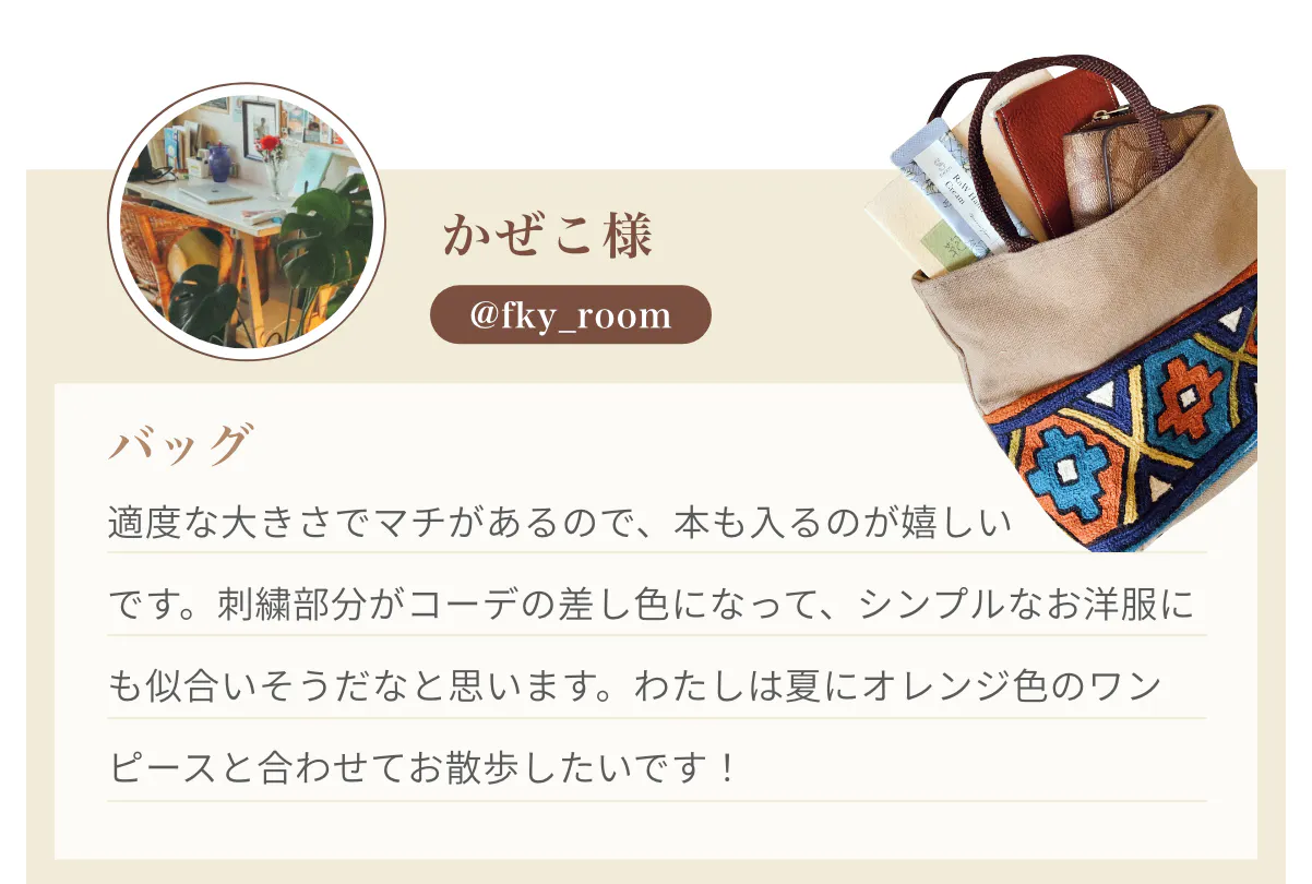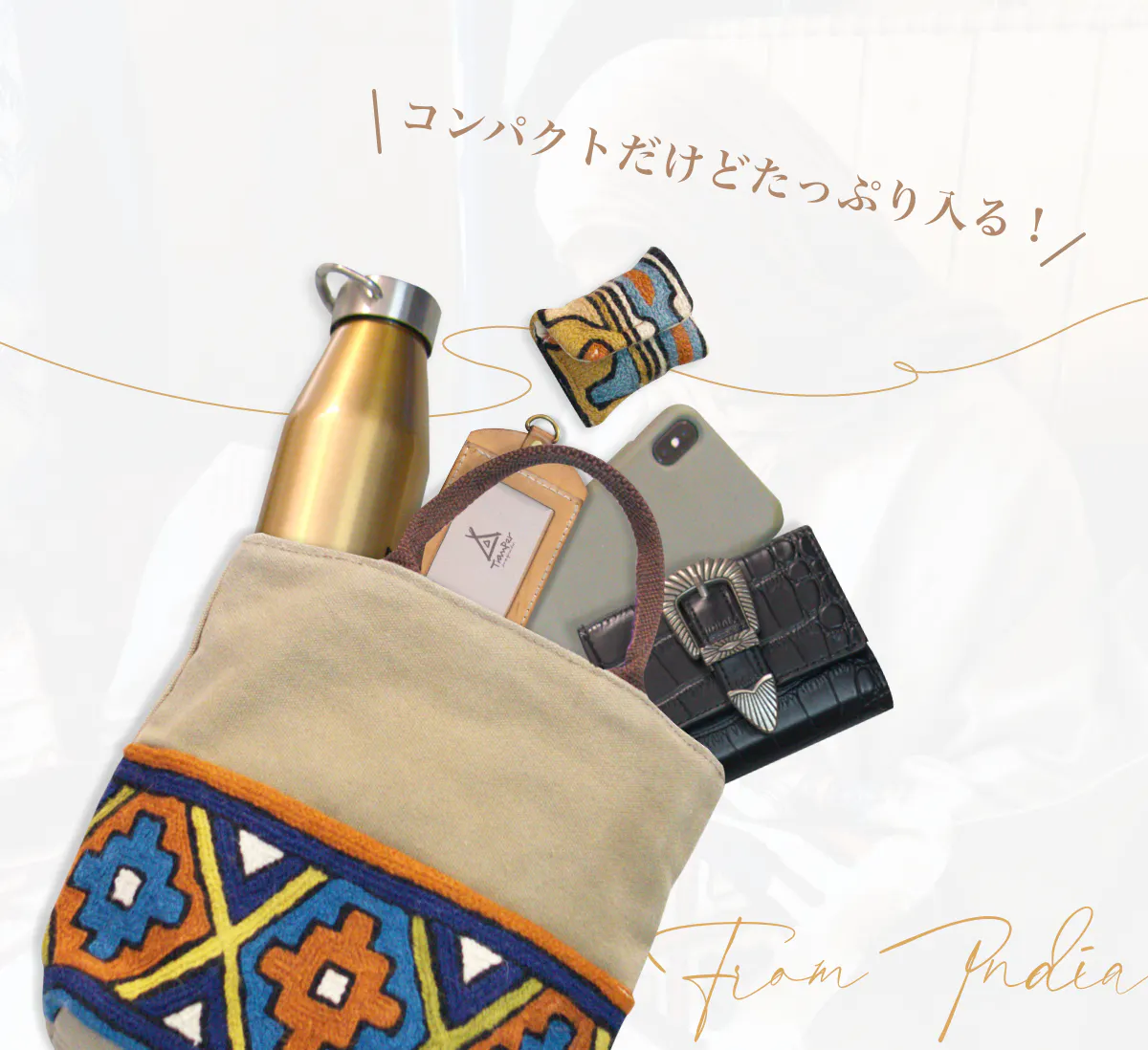 ✥刺繍が施された、インド帆布バッグ。デイリーコーデのアクセントにも。
