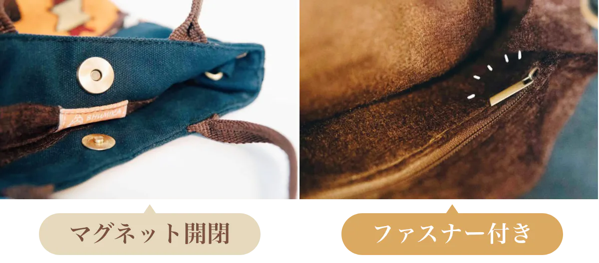 バッグ口は開閉しやすいマグネット式。ファスナーポケットもついているので小物の収納も安心です。