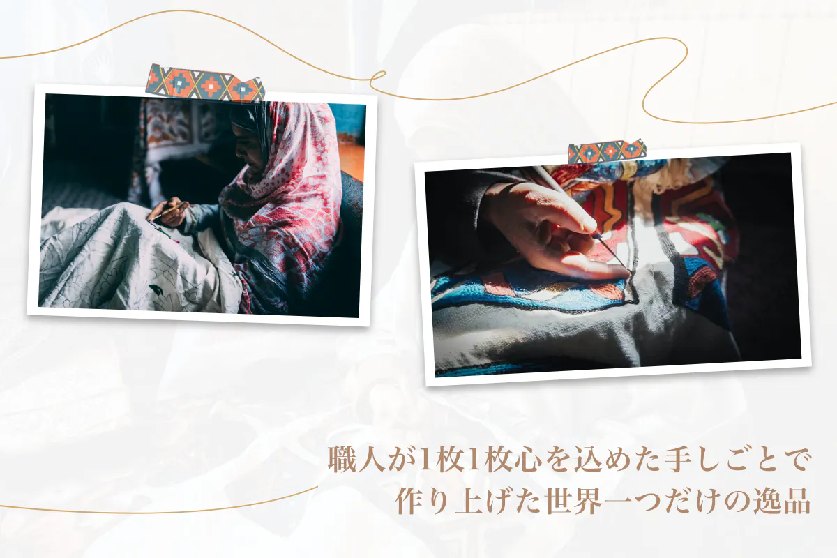 カシミールはインドの最北端の領土であり、雪に覆われたヒマラヤ山脈と緑豊かなバンガル山脈の間に位置します。「カシミール刺繍」は目の揃った美しいチェーンステッチが特徴です。細密画のような繊細なデザインは見る者を魅了します。そんな昔から存在している刺繍技術はカシミールの家庭の中で代々継承され、現在まで伝えられてきました。現代まで受け継がれた技術を絶やさなぬよう、この刺繍工芸を未来へつなぐお手伝いをしたいと思っています。