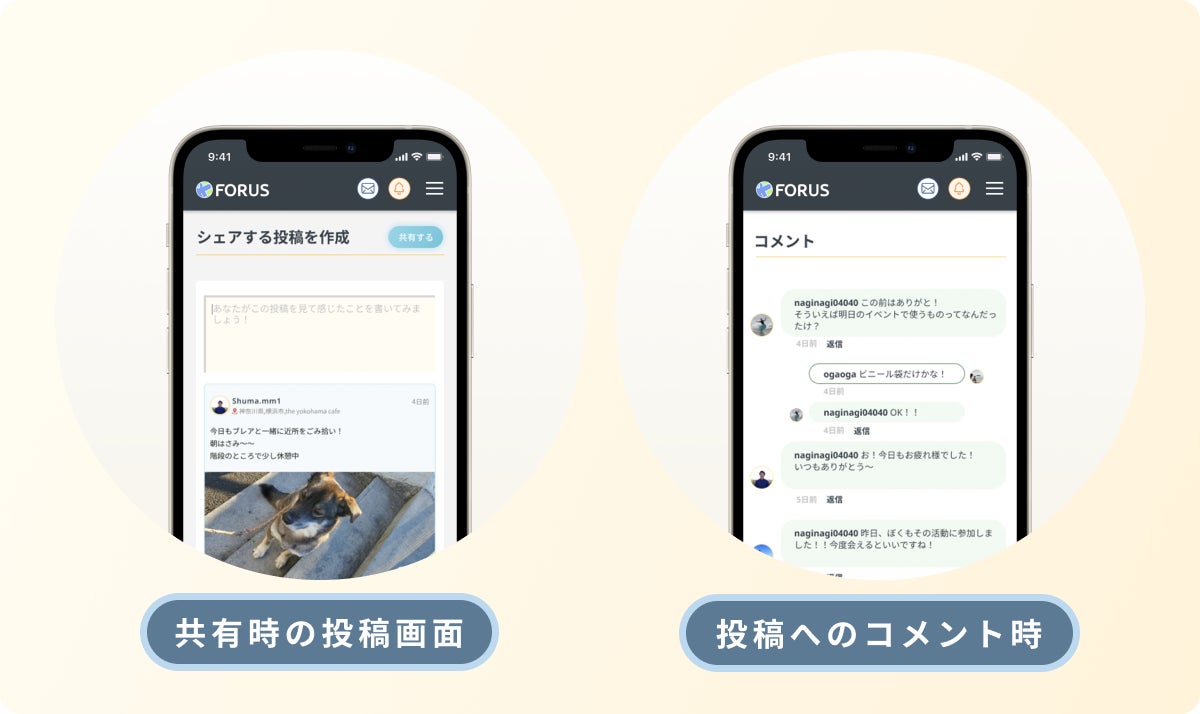 また、投稿に対してコメントや共有ができる機能を用意しているので、「FORUS 」一人ひとりのがんばりをみんなで感謝、応援できるような環境にしたいと考えています。