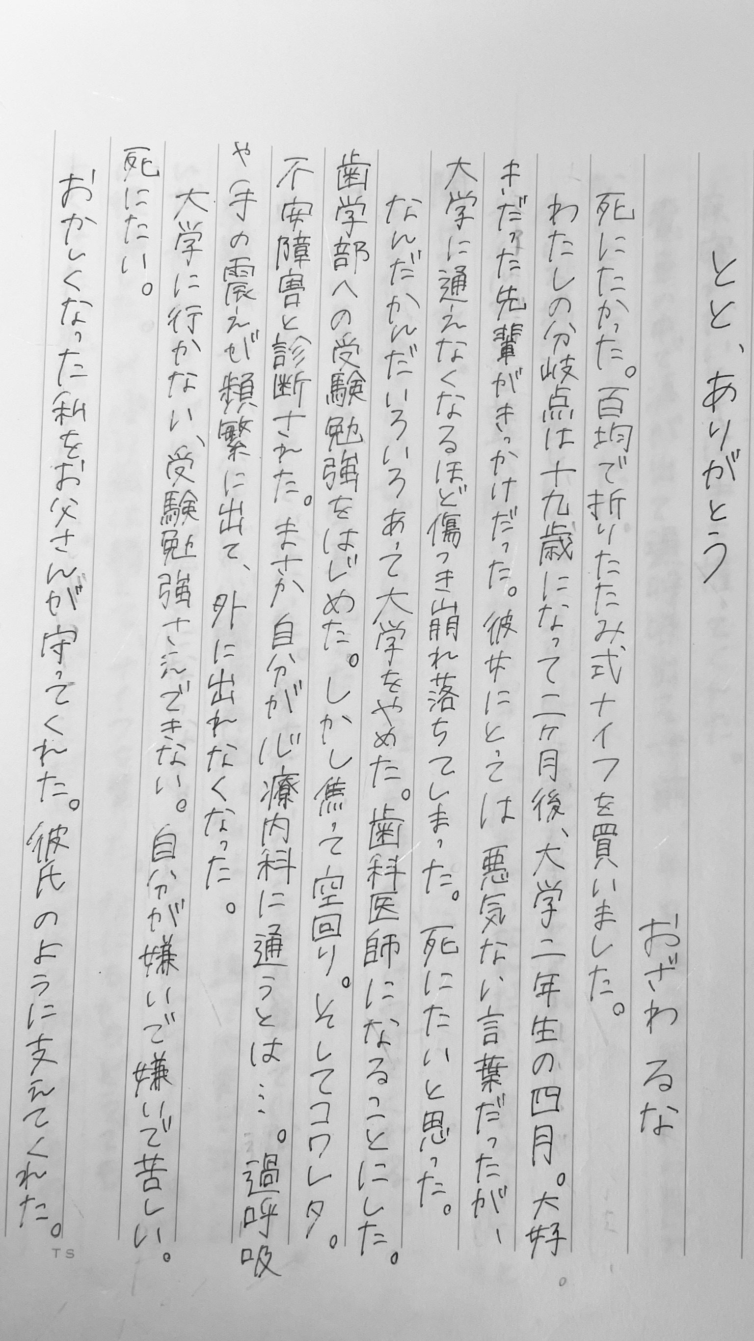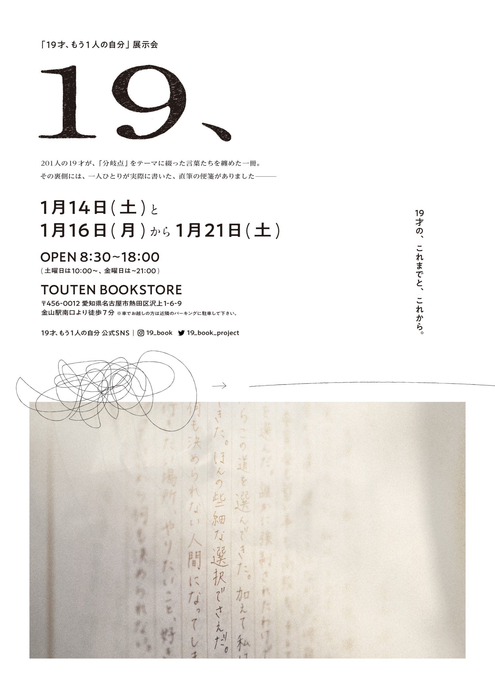 2023/01/13 17:59お久しぶりです!プロジェクト発起人の佐藤友美です。直前のご報告になってしまい申し訳ないのですが、明日より名古屋のTOUTEN BOOKSTOREさんで展示会を行います!ーーーーーーーーーー全国から集まった201人の19才が人生を振り返り、「分岐点」を基に思いの丈を綴った直筆の原本が展示されます。周りとちがう自分に苦しんだことがある人や、将来に不安を感じる人、若者の考えが知りたい大人など。さまざまな方にささる展示だと思います。色んな価値観や人生に触れ、自分自身の人生も振り返る。そんなきっかけとなる展示会になることを願います!どうぞこの機会にお越しいただければと思います。よろしくお願いします!ーーーーーーーーーー日時 : 2023年1月14日(土)と16日(月)から21日(土)Open : 8:30〜18:00(土曜日は10:00〜、金曜日は〜21:00)場所 : TOUTEN BOOKSTORE 〒456-0012 愛知県名古屋市熱田区沢上1-6−9金山駅南口より徒歩7分※車でお越しの方は近隣のパーキングに駐車してください。予約不要、入場無料[在廊日]1/14(土)午前 佐藤(僚)午後 佐藤(友)夕方 内村1/21(土)午前 内村午後 佐藤(僚)夕方 佐藤(友) もっと見る