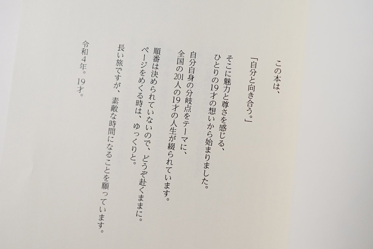 201人の19才が自分と向き合い綴った文章に触れ、いまの、あの頃の、これからの自分を想う時間になること。時に刺激や発見、そして共感や勇気をくれ、自分に正直でいられること。少しでもみなさまの心の支えになれることを願っています。